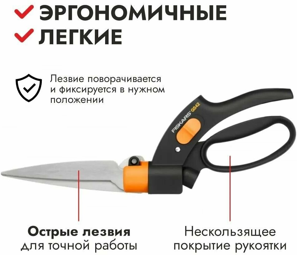 Садовые ножницы для травы Fiskars GS42 Servo-System - удобный и практичный инструмент для домашнего использования. Лезвия выполнены из нержавеющей стали, инновационная поворотная конструкция гарантирует комфортную эксплуатацию.