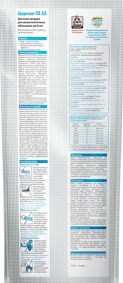Затирка Ceresit СЕ 33 Comfort используется для заделки межплиточных швов шириной до шести миллиметров при облицовке стен и пола кафелем, керамогранитом или камнем, подходит для зон, постоянно контактирующих с водой.