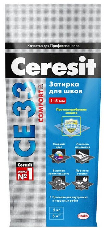 Затирка Ceresit СЕ 33 Comfort используется для заделки межплиточных швов шириной до шести миллиметров при облицовке стен и пола кафелем, керамогранитом или камнем, подходит для зон, постоянно контактирующих с водой.