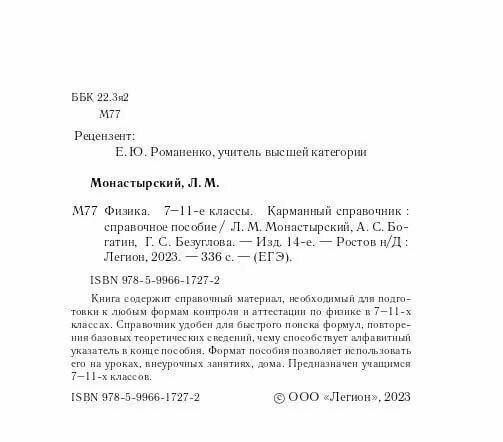 Физика. 7–11-е классы. Карманный справочник (Богатин Александр Соломонович, Монастырский Лев Михайлович, Безуглова Галина Сергеевна); Легион, 2023
