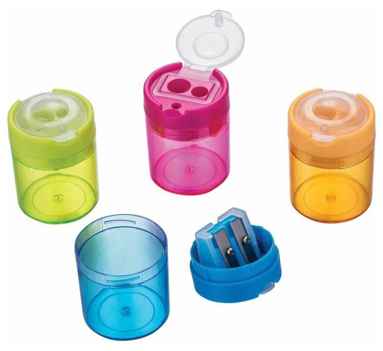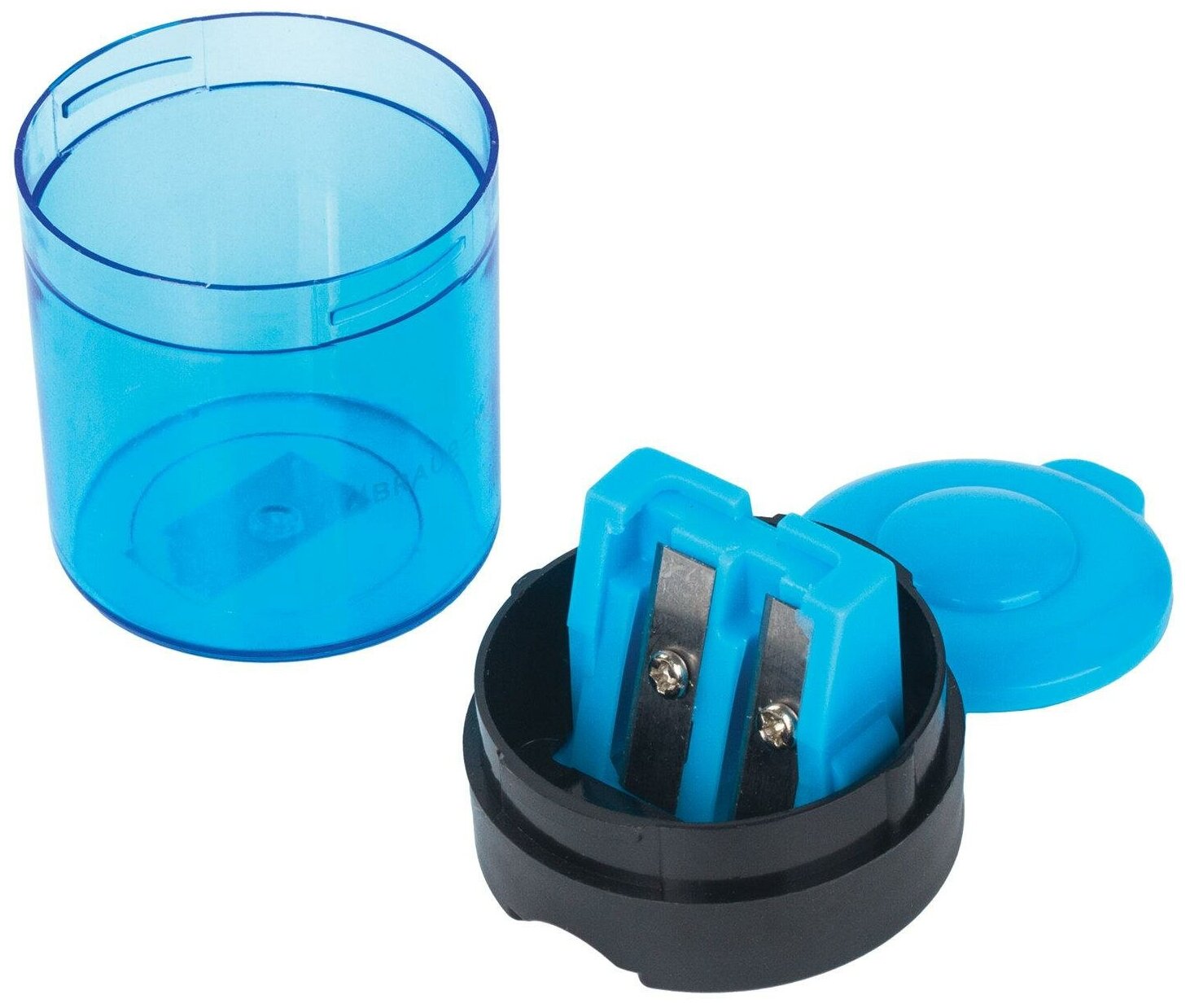 Корпус цилиндрической формы выполнен из пластика. Точилка оснащена двумя отверстиями для заточки карандашей разного диаметра и крышкой для закрытия отверстий. Острое стальное лезвие обеспечивает быструю и легкую заточку. Карандаш затачивается аккуратно, а опилки остаются в специальном контейнере. Размер: 56х39х39 мм.