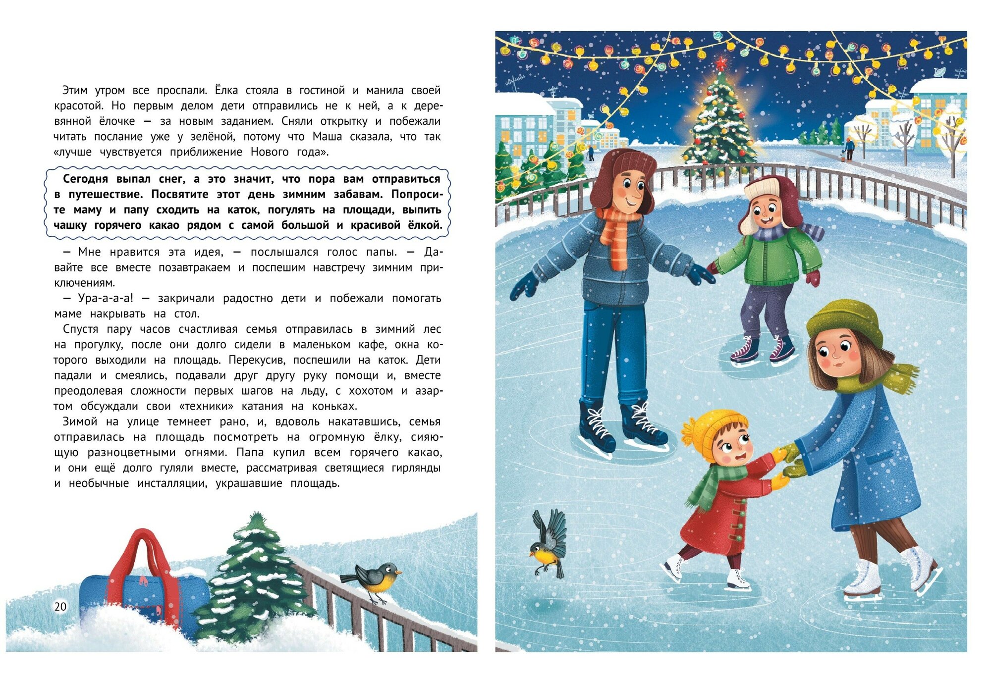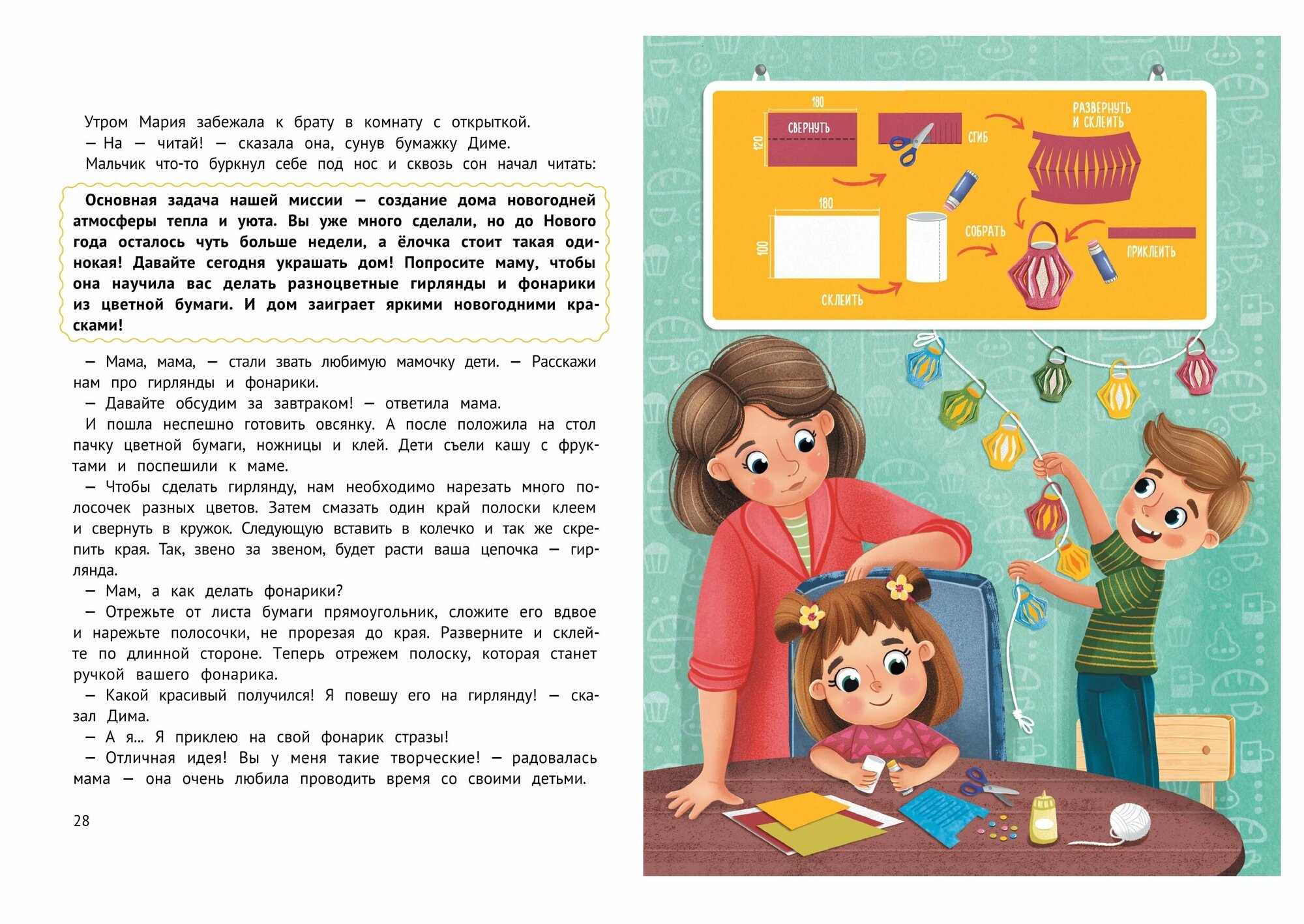 Каждый ребёнок с нетерпением ждёт Нового года, ведь это самый волшебный праздник в году. Чтобы ожидание праздника было интересным и запоминающимся, мы подготовили настоящую миссию для юных читателей. Вместе с Димой и Машей будем учиться лепить снеговика и ёлочку из пластилина, мастерить сверкающие открытки, вырезать гирлянды и фонарики для украшения комнаты, печь ароматное новогоднее печенье и многое-многое другое. С этой книгой ребёнок запомнит не только запах мандаринов и подарки под ёлкой, но и подготовку к празднику, которая будет наполнена весёлыми активностями, творчеством и счастливыми моментами, проведёнными вместе с семьёй.