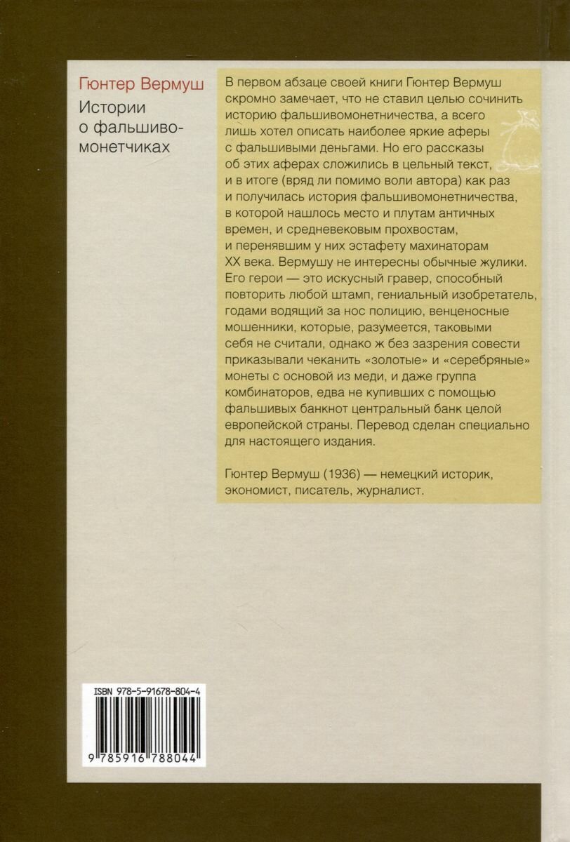 В первом абзаце своей книги Гюнтер Вермуш скромно замечает, что не ставил целью сочинить историю фальшивомонетничества, а всего лишь хотел описать наиболее яркие аферы с фальшивыми деньгами. Но его рассказы об этих аферах сложились в цельный текст, и в итоге (вряд ли помимо воли автора) как раз и получилась история фальшивомонетничества, в которой нашлось место и плутам античных времен, и средневековым прохвостам, и перенявшим у них эстафету махинаторам XX века. Вермушу не интересны обычные жулики. Его герои — это искусный гравер, способный повторить любой штамп, гениальный изобретатель, годами водящий за нос полицию, венценосные мошенники, которые, разумеется, таковыми себя не считали, однако ж без зазрения совести приказывали чеканить «золотые» и «серебряные» монеты с основой из меди, и даже группа комбинаторов, едва не купивших с помощью фальшивых банкнот центральный банк целой европейской страны. Перевод сделан специально для настоя-шего издания.