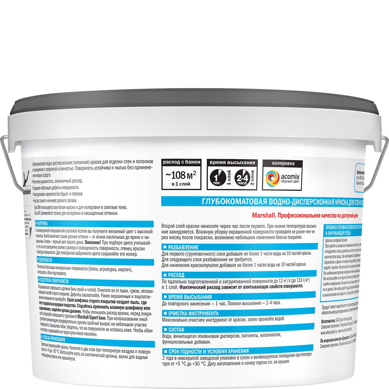 Marshall - бренд компании AkzoNobel, крупнейшего мирового производителя лакокрасочной продукции. Краска выпускается на российском заводе, соответствует международным стандартам качества.