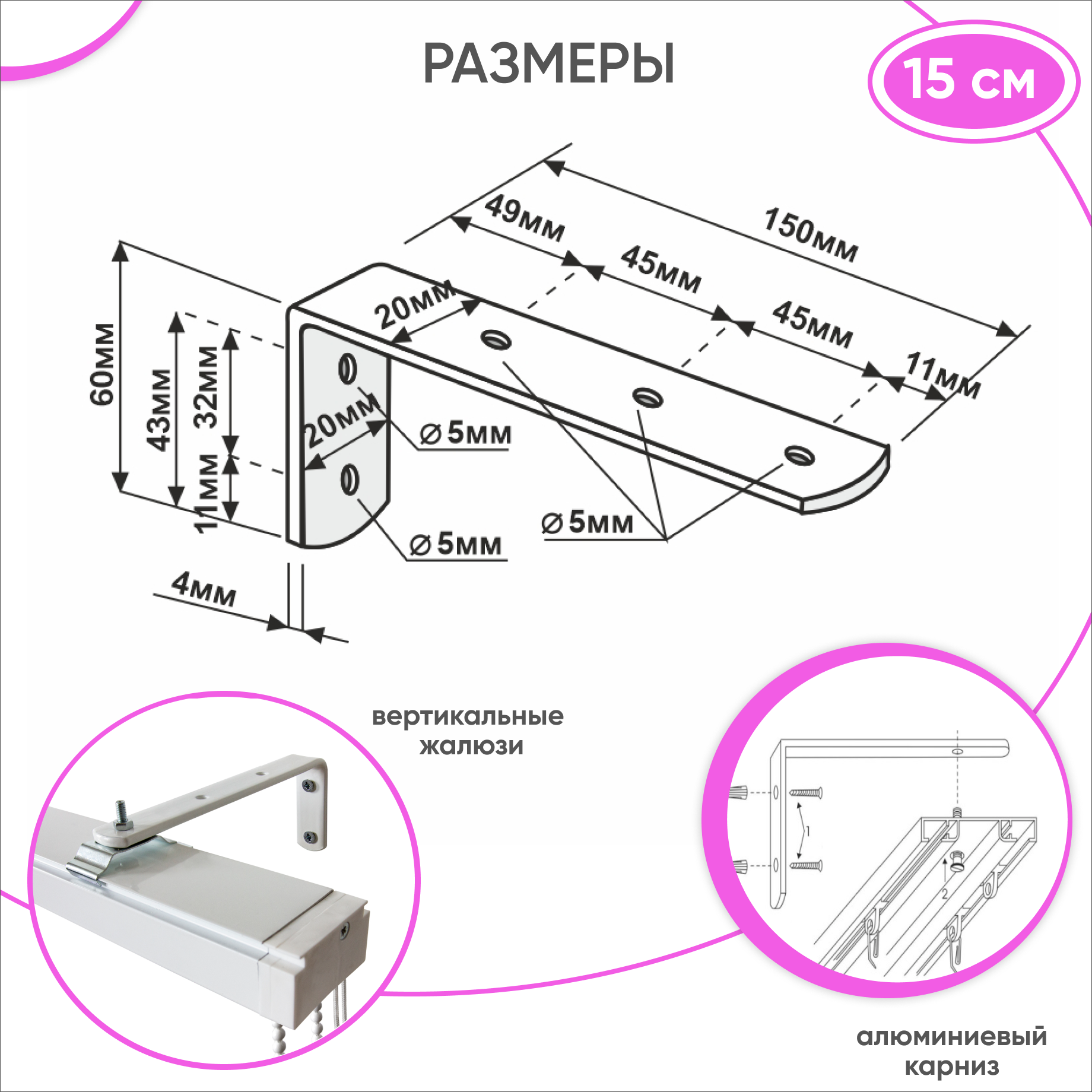 Кронштейн настенный для вертикальных жалюзи, 15 см, Цвет - белый. Материал - металл. Комплектация: кронштейн - 1 шт крепежный комплект - 1 шт. Произведено в России.