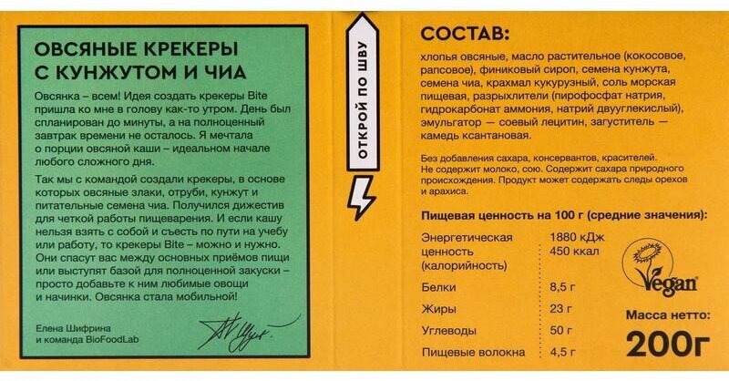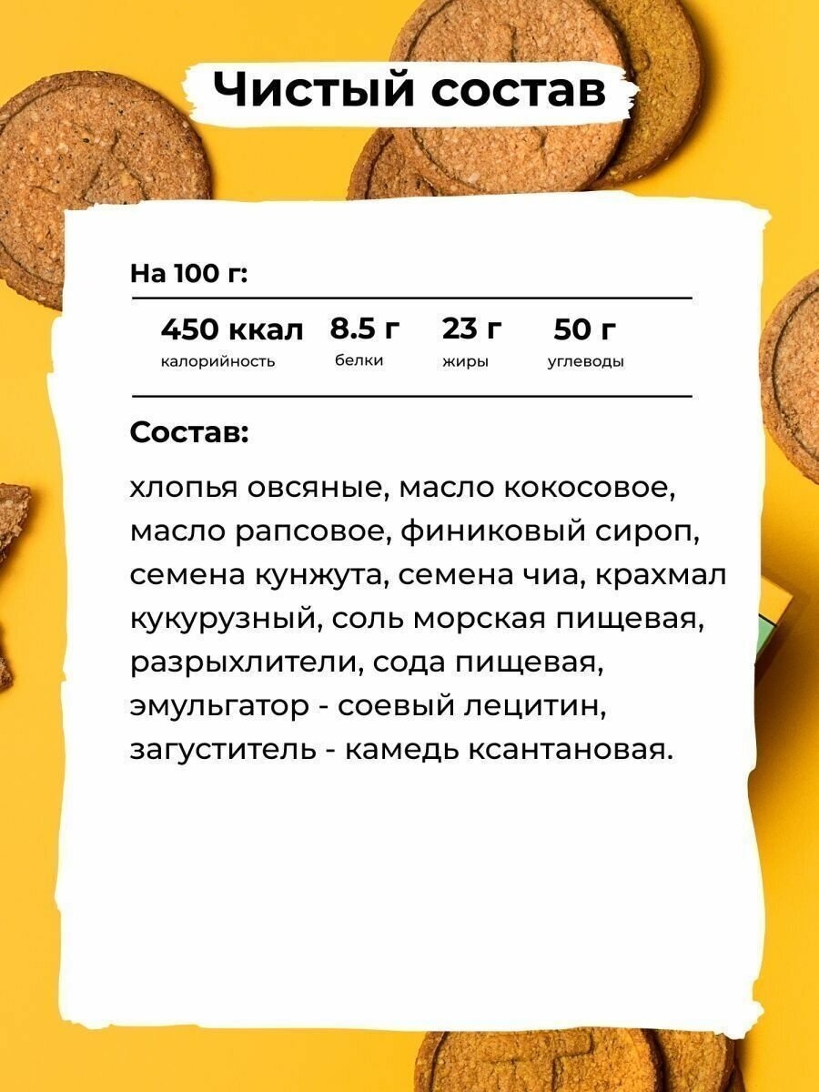 | Состав | Хлопья овсяные, отруби овсяные, мука овсяная, финиковый сироп, масло рапсовое, кунжут, семена чиа, яблочный порошок, соль, сода пищевая. |