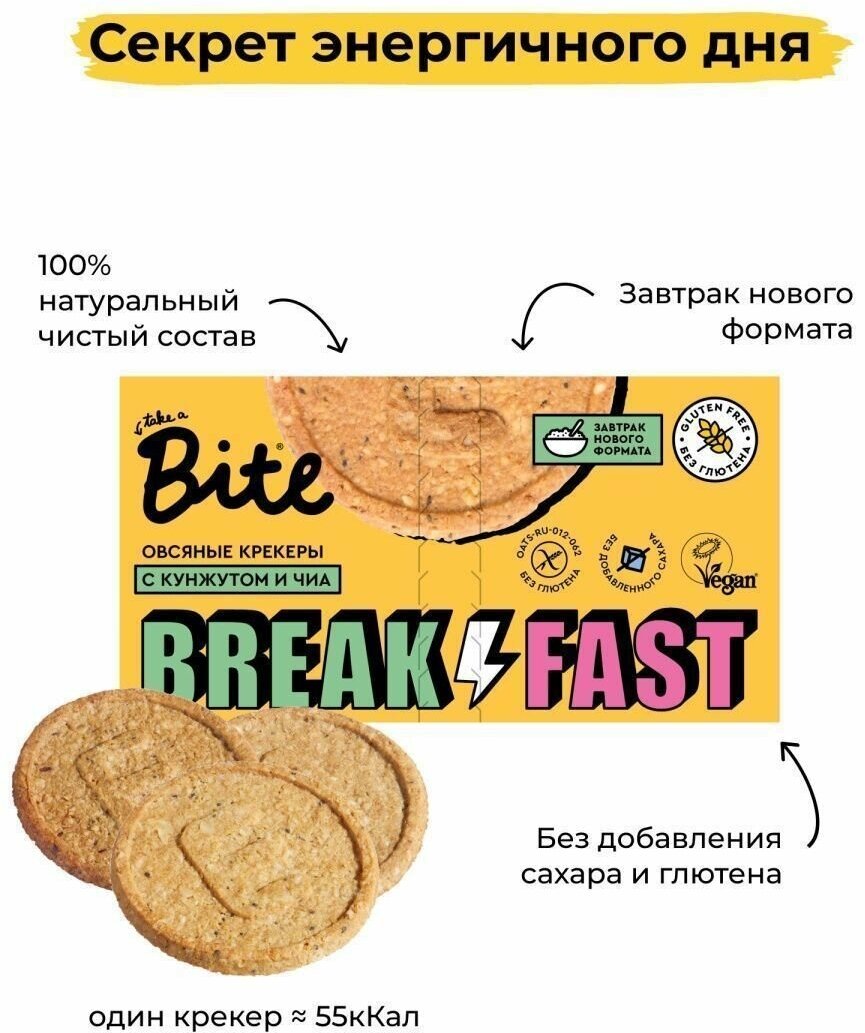 Что такое овсяные крекеры Bite? Это идеальный веганский перекус без добавления сахара, богатый клетчаткой и растительным белком. В основе каждого вкуса микс из овсяных хлопьев, овсяной муки и отрубей. Почему именно овсянка? Из-за богатого нутриентного состава! Получается питательный хрустящий снек из 100% натуральных ингредиентов без добавления сахара и дрожжей. Крекеры Bite это самостоятельный продукт, который вкусно и полезно есть просто так. А еще, это здоровая альтернативу сэндвичу абсолютно не скучная! Добавьте сыр, творог и любимые овощи для сытного завтрака, сочетайте с хумусом и гуакамоле для быстрой закуски, а если намазать на крекеры арахисовую пасту, украсить бананом и финиковым сиропом Bite получится настоящий десерт.