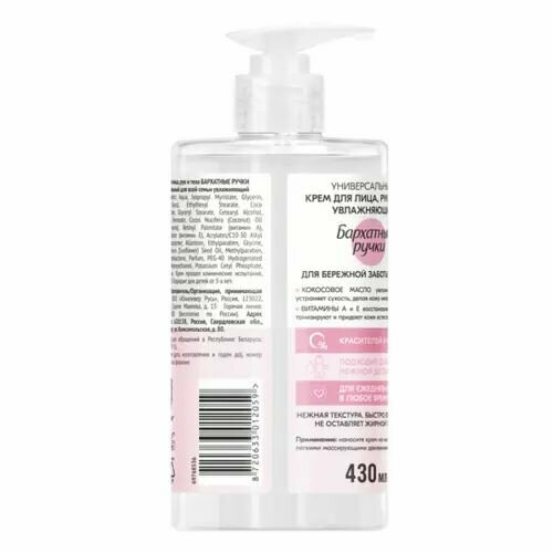 Крем Бархатные ручки Универсальный Питание и увлажнение с маслом кокоса и витаминами А и Е уменьшает признаки раздражения и шелушения, укрепляет собственный защитный барьер кожи. Универсальная формула подходит для кожи лица, тела и рук, быстро впитывается без жирности и липкости. Подходит для чувствительной кожи. Одобрен дерматологами.