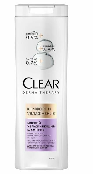 Чтобы вернуть к жизни сухие волосы и кожу головы, воспользуйтесь продуктами из новой серии Clear Derma Therapy Комфорт и увлажнение. Первый шаг мягкий увлажняющий шампунь. Его формула устраняет перхоть, бережно очищает и успокаивает кожу головы, сокращая сухость, зуд и стянутость'', увлажняет волосы, придавая им естественный блеск и сияние. [1] удаляет видимую перхоть при регулярном использовании. [''] вызванные перхотью.
