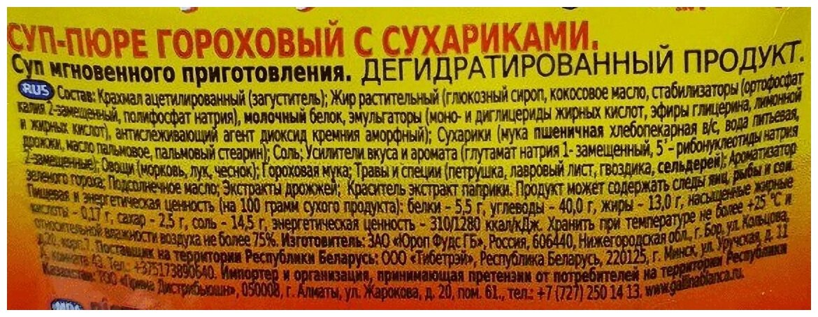 Гороховый суп-пюре Gallina Blanca необычайно сытный, вкусный и полезный! Идеальное и быстрое решение для горячего перекуса: густой и ароматный суп согревает и наполняет силами на весь день. В составе натуральные травы и специи. Без глутамата натрия. 1. Засыпать содержимое пакетика в кружку или пиалку. 2. Добавить 200 мл кипятка. 3. Хорошо перемешать и подождать 1 минуту.