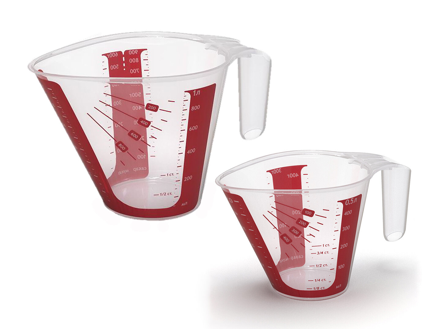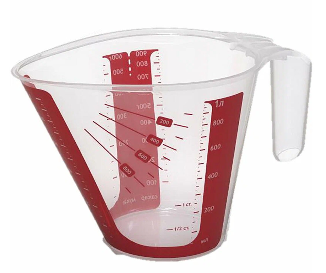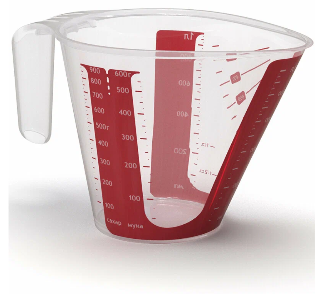 Меры указаны для жидкостей в миллилитрах, для сыпучих продуктов в граммах и в стаканах. Отдельные шкалы для сахара и муки.