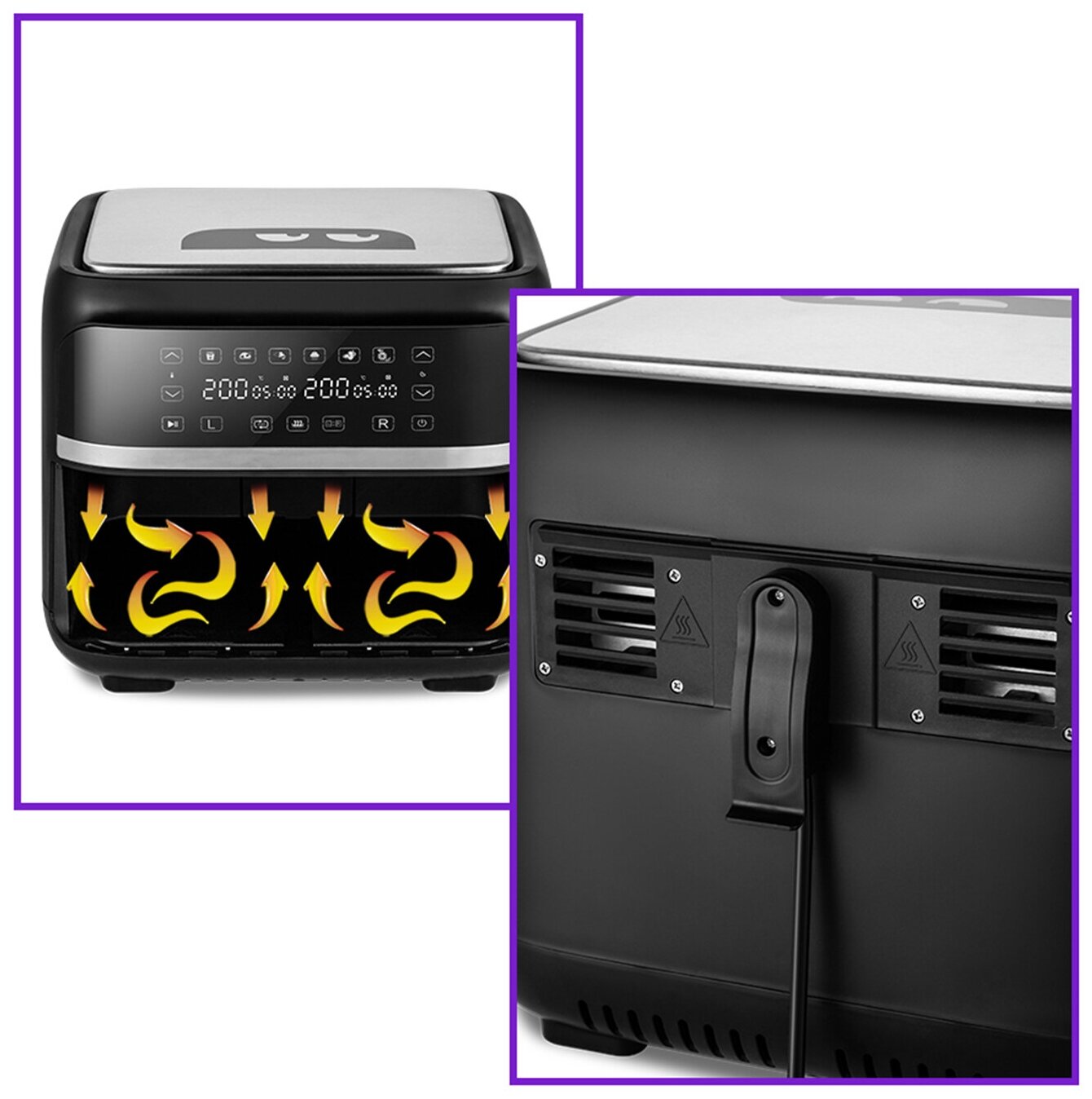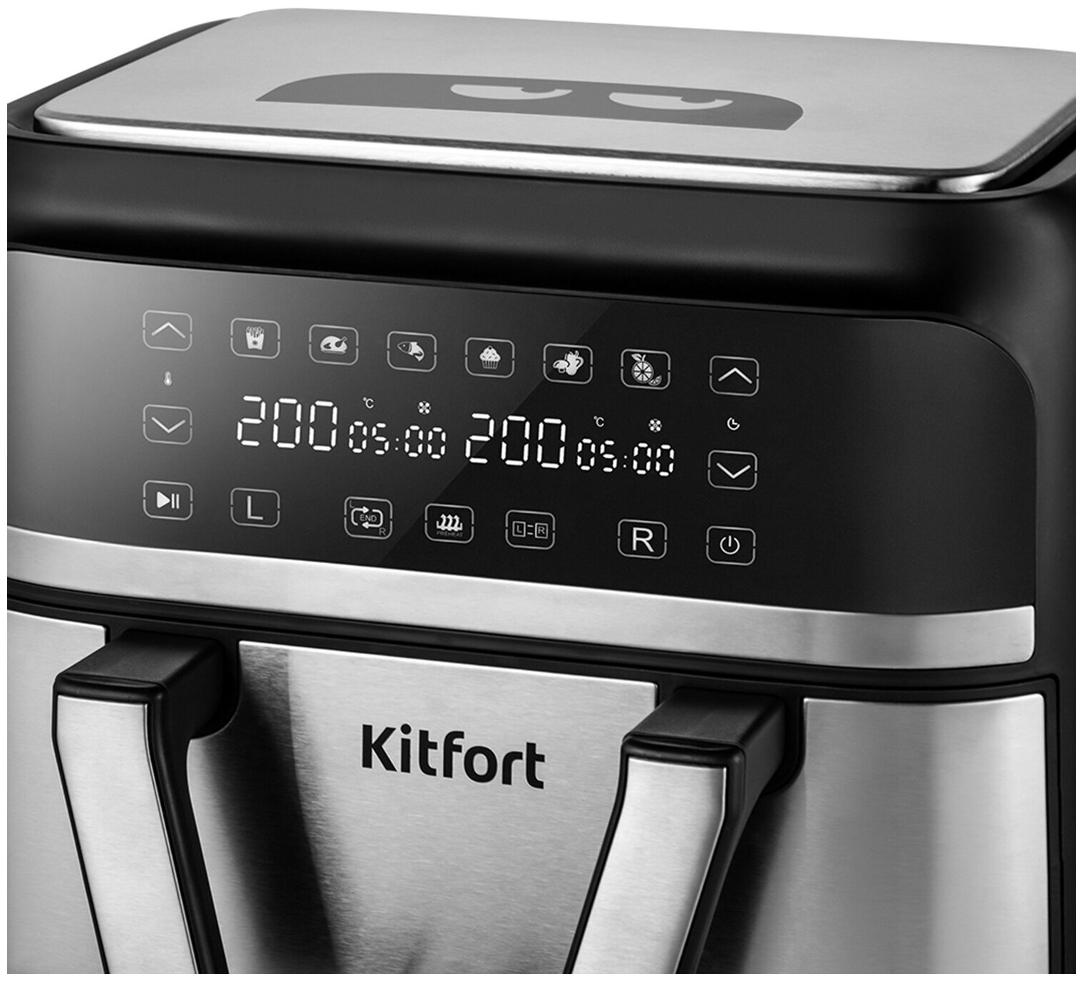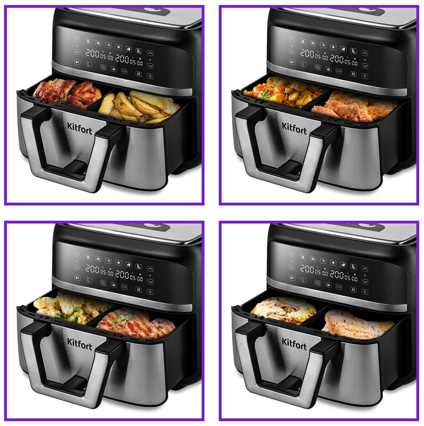 Аэрогриль КТ-2247 с 2 раздельными нагревателями интересен стильным дизайном, а также позволяет готовить большинство продуктов без добавления масла, а также может использоваться как сушилка для фруктов и овощей. Главное преимущество КТ-2247 - наличие 2х нагревателей. Разделителем, который идёт в комплекте, вы можете поделить поддон на 2 части и готовить 2 разных блюда одновременно, установив для каждого свои настройки t и таймера. Например, мясо и гарнир. Продукты готовятся на решётках, которые вставлены в поддон. Благодаря системе циркуляции горячего воздуха, продукты обжариваются равномерно со всех сторон, получаясь нежными внутри и с хрустящей корочкой снаружи. Прибор оснащён сенсорным управлением, имеет 6 программ, синхронизацию приготовления и подогрев. Можно установить таймер до 60 мин и t° до 200°C для каждого нагревателя. На дисплее отображаются заданные параметры и какие нагреватели работают. Продукты готовятся на специальных решётках, установленных в поддон. И решётки, и поддон с антипригарным покрытием. Все части, в том числе и разделитель, легко разбираются и моются. Ручка поддона не нагревается, за неё удобно держаться. В аэрогриле есть специальная программа для сушки овощей и фруктов с таймером от 1 до 24 часов и температурой от 40 до 80 градусов, что идеально подходит для этой задачи.