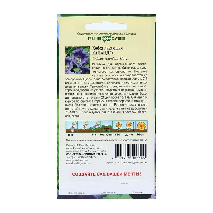 Растение теплолюбивое, лучше произрастает на солнечных участках. Для большей урожайности необходима подкормка минеральными удобрениями. Посев семенами на рассаду лучше проводить в марте. Первые всходы произрастают через две недели. Рассада пикируется по одному растению.Высаживание в открытый грунт - после появления настоящих листьев. Высадка в открытый грунт в мае.Основное предназначение кобеи - озеленение оград, лоджий, беседок.