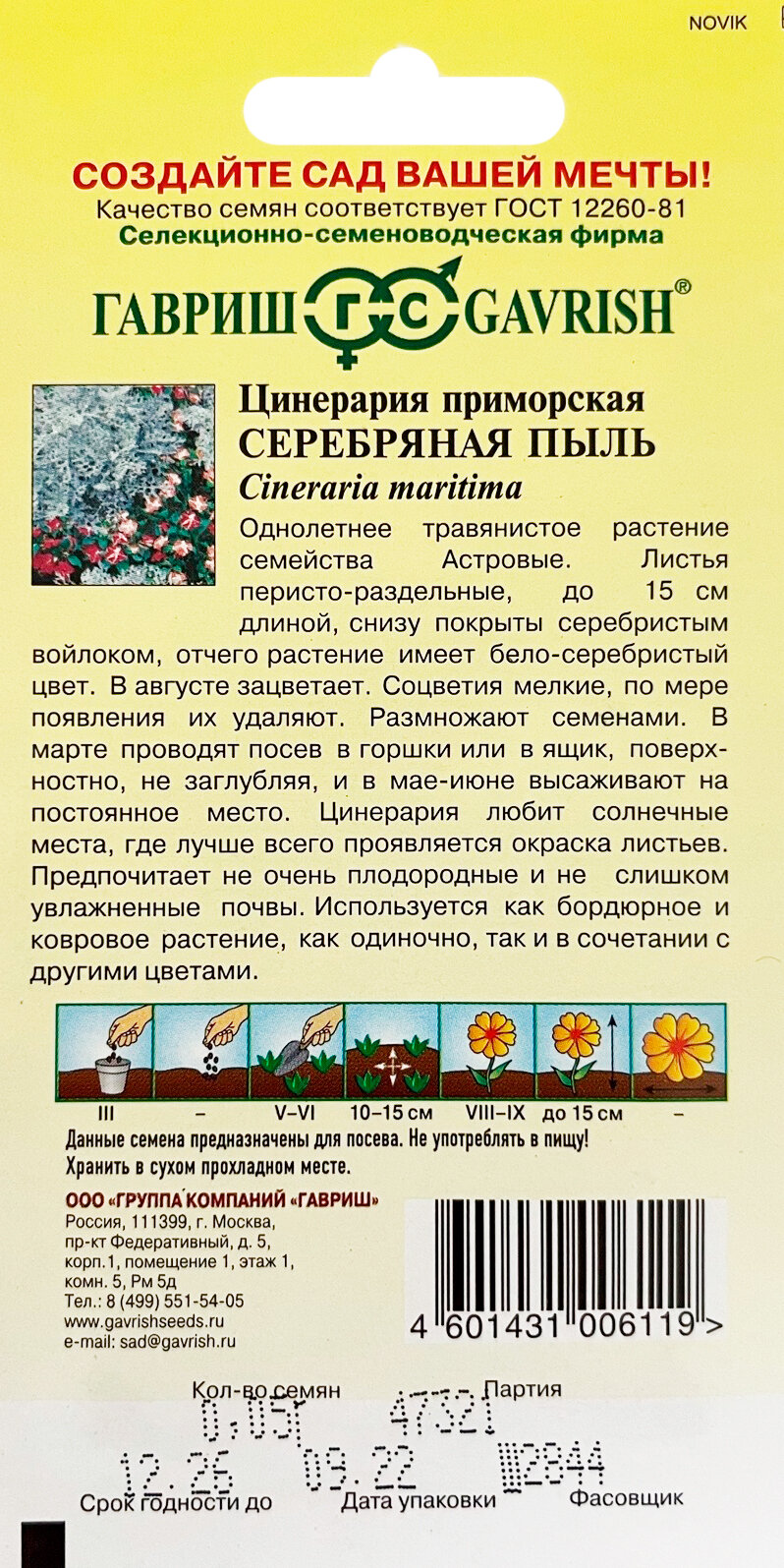 На сегодняшний день товар «Цинерария приморская Серебряная пыль Гавриш» можно купить с кешбеком в 1 магазине: Яндекс.Маркет