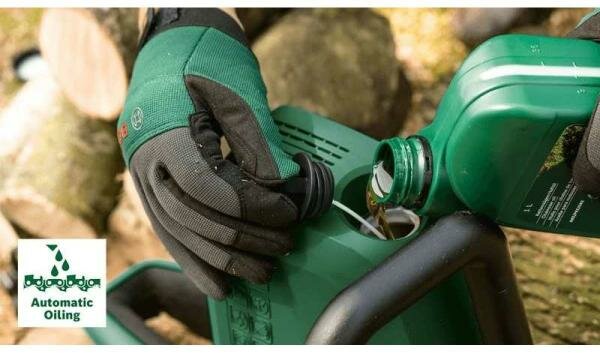Большой боковой масляный бак с практичной крышкой обеспечивает легкое заполнение автоматической системы смазки цепи.