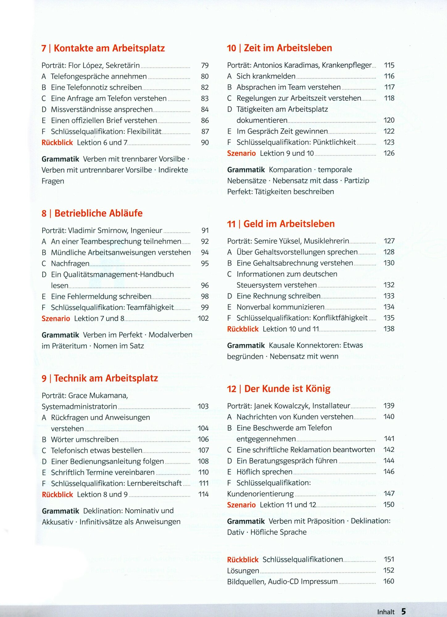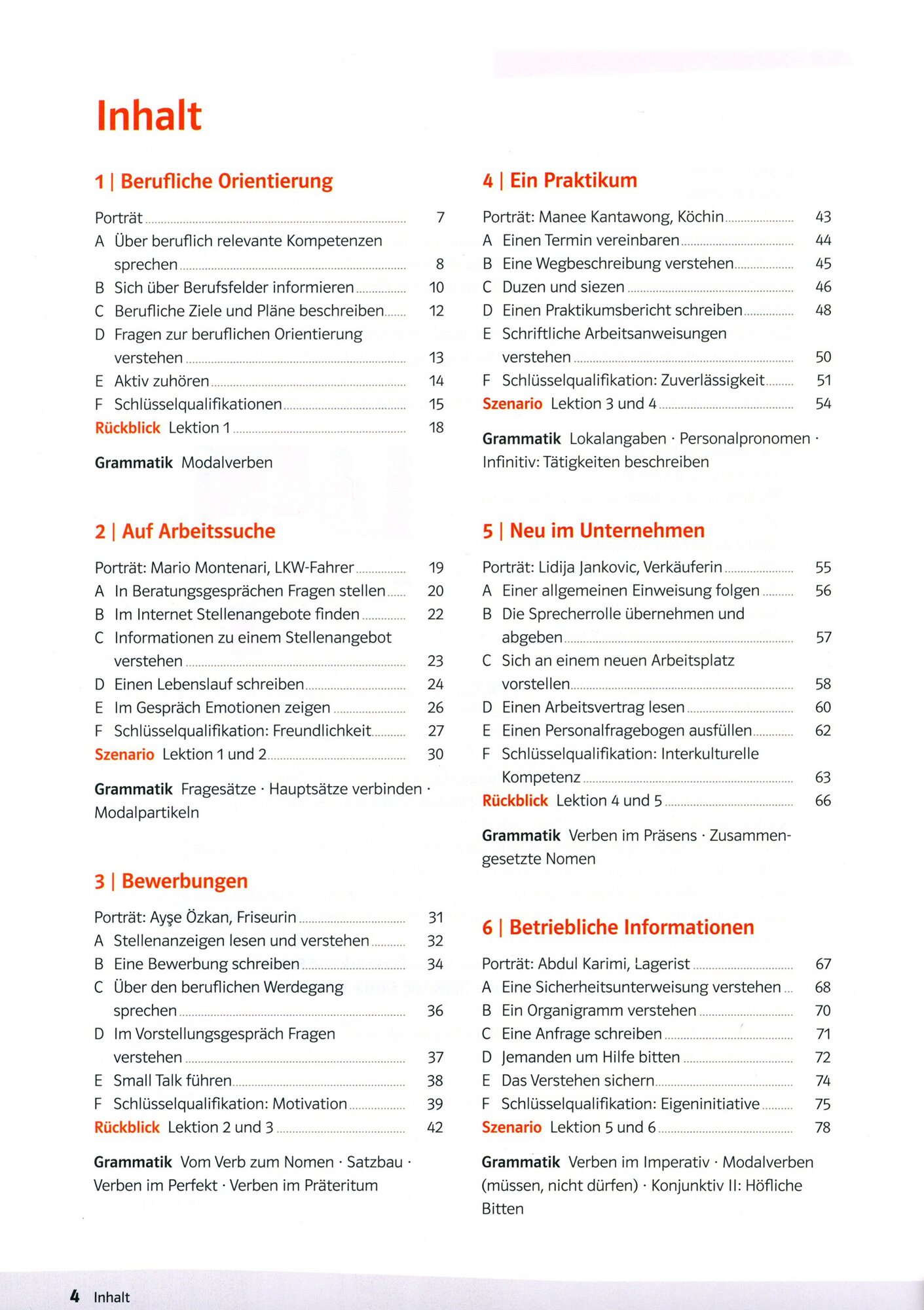 Macht fit fьr die Arbeitssuche in Deutschland - Portrдts von Personen in verschiedenen Branchen und Berufen- Vielfдltige Themen zur beruflichen Integration (z B Anerkennung auslдndischer Berufsabschlьsse, Umschulungen) Trainiert die Kommunikation am Arbeitsplatz - Wichtige berufsbezogene Sprachhandlungen- Ausfьhrliches Schreibtraining mit Mцglichkeit zur Binnendifferenzierung- Grammatik fьr den Berufsalltag und zum Verstehen von Fachtexten Fцrdert individuell und praxisnah - Flexibel kombinierbare Module und Szenario-Seiten- Kleinschrittige Aufgabenfolgen mit vielen Rollenspielen- Einheiten zur Selbstevaluation und Lektionstests