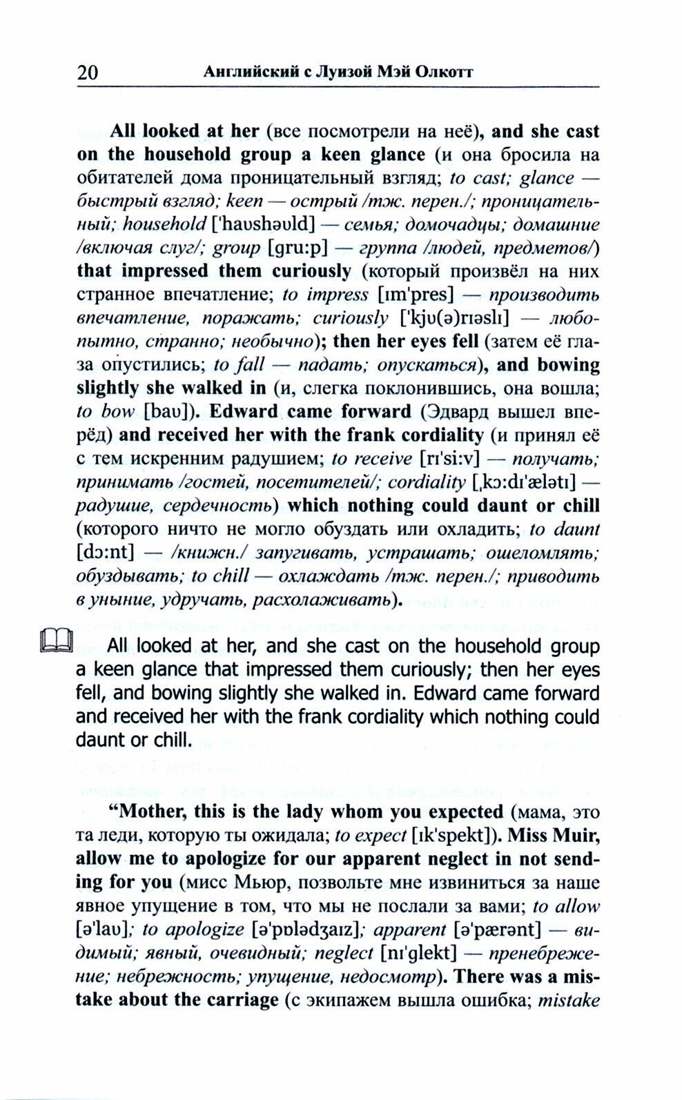 Повесть Луизы Мэй Олкотт, автора полюбившихся читателям романов «Маленькие женщины», «Хорошие жены» и др., адаптирована в настоящем издании по методу Ильи Франка: снабжена дословным переводом на русский язык и необходимым лексико-грамматическим комментарием (без упрощения текста оригинала). Уникальность метода заключается в том, что запоминание слов и выражений происходит за счет их повторяемости, без заучивания и необходимости использовать словарь. Кроме' того, читатель привыкает к логике английского языка, начинает его «чувствовать».