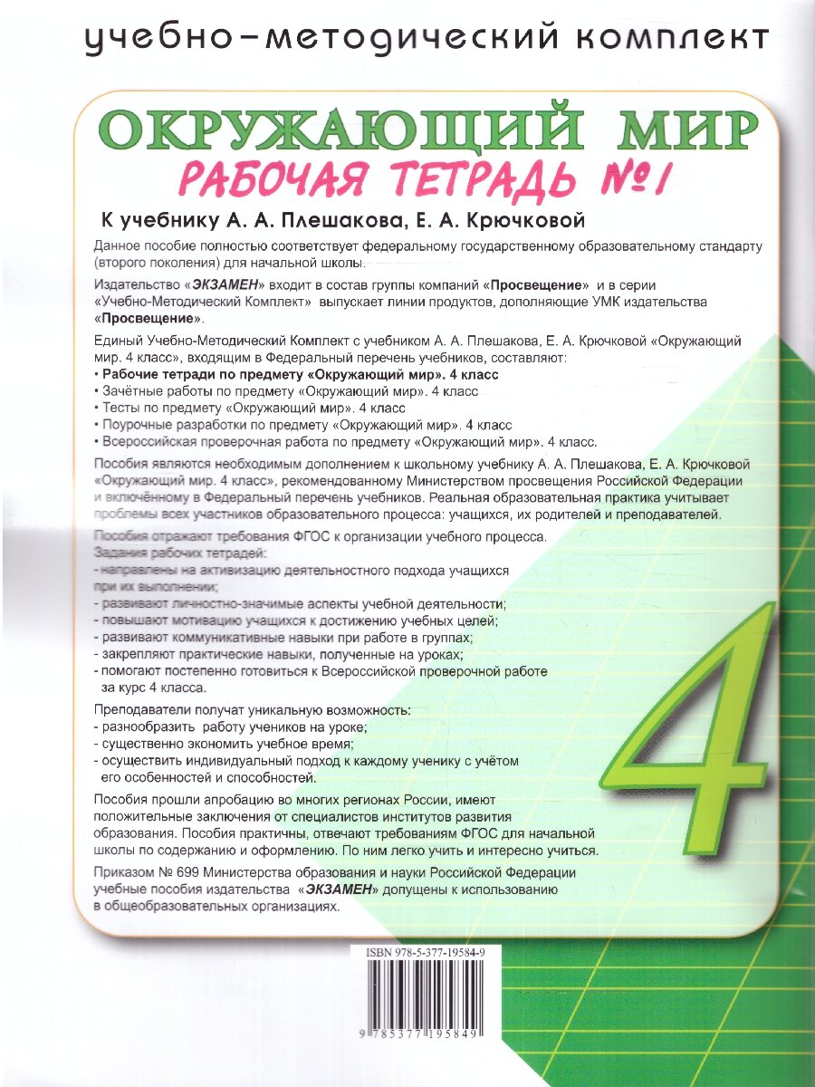Рабочая тетрадь является составной частью учебно-методического комплекта к учебнику А. А. Плешакова, Е. А. Крючковой «Окружающий мир. 4 класс. В 2-х частях. Часть 1».