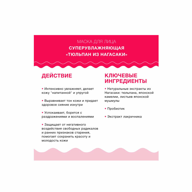 Действие маски направлено на комплексное улучшение состояния кожи и способствует достижению эффекта Glass Skin – чистой, гладкой, увлажненной и сияющей изнутри кожи. Интенсивный курс из 7 тканевых масок обеспечивает видимый эффект при ежедневном использовании. Действие: Интенсивно увлажняет, делает кожу " напитанной" и упругой. Выравнивает тон кожи и придает здоровое сияние изнутри. Успокаивает, борется с раздражениями и воспалениями. Защищает от негативного воздействия свободных радикалов и ранних признаков старения, помогает сохранить красоту и молодость кожи. Ключевые ингредиенты: Натуральные экстракты из Нагасаки: тюльпана, японской камелии, листьев японской мушмулы; Пробиотик; Экстракт лакричника. Применение: Наложите маску на предварительно очищенную кожу, при необходимости слегка растяните для плотного прилегания. Рекомендуемое время процедуры 5-10 минут. Остатки сыворотки мягко вмассируйте в кожу.