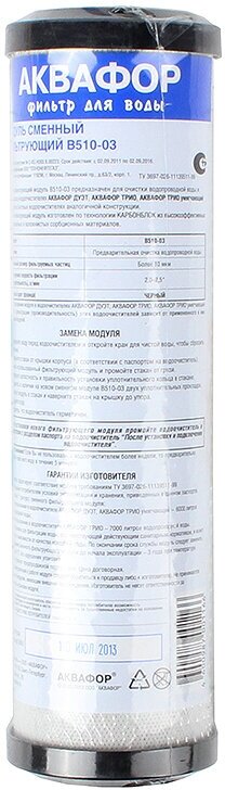 Удаляет практически все вредные примеси. Используется в стационарных системах АКВАФОР с отдельным краном.Подходит к системам других производителей, использующих 10-ти дюймовый стандарт корпуса.