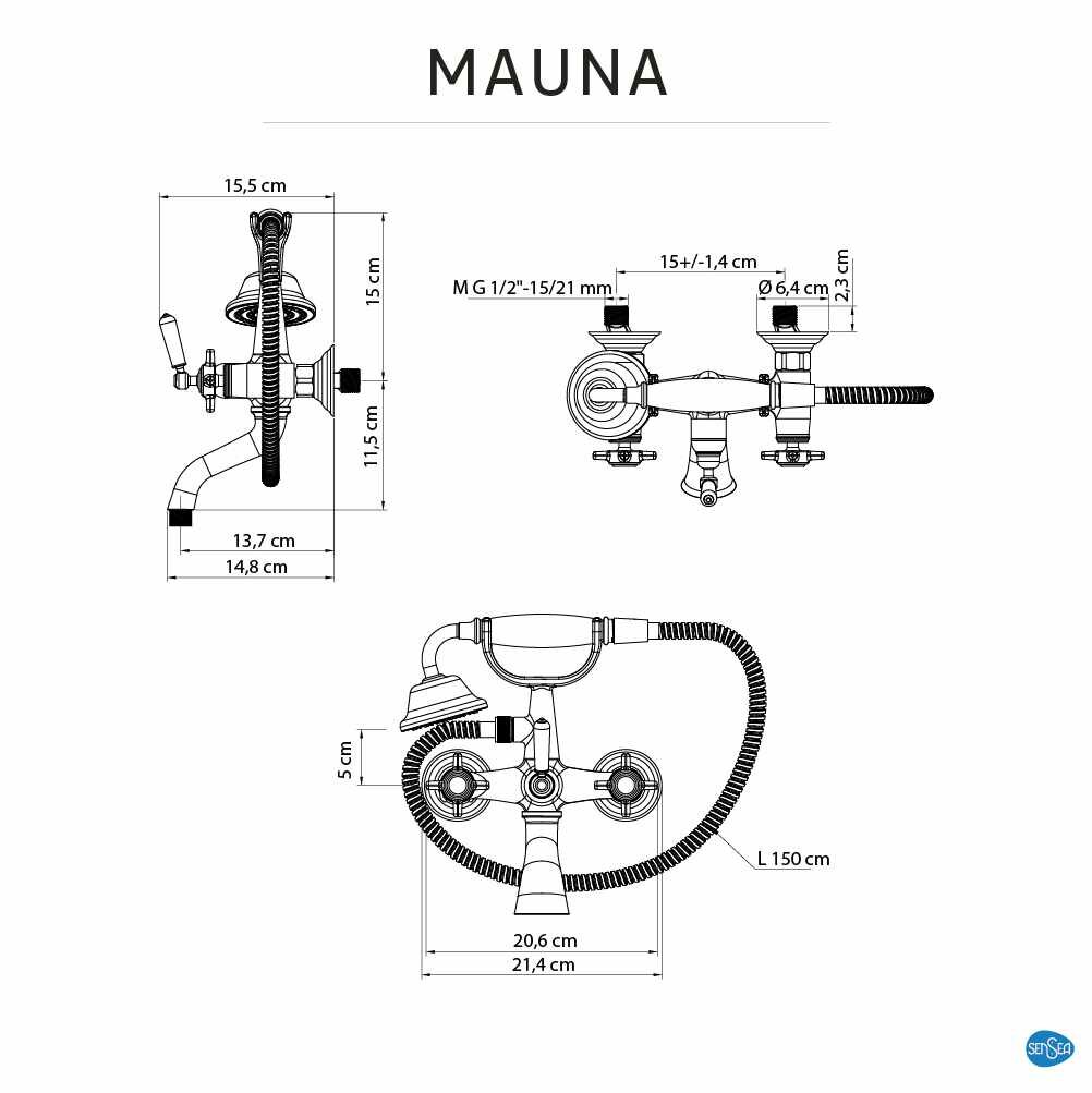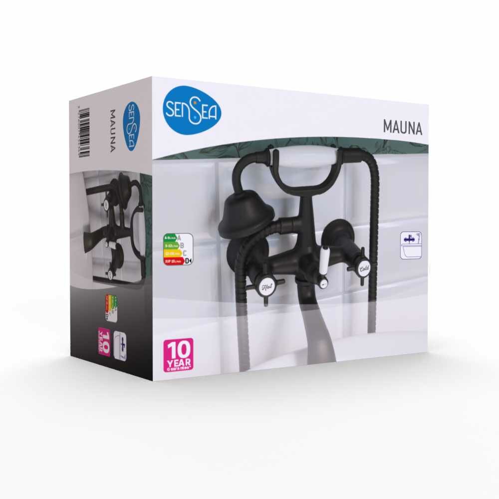 **Смеситель Sensea Mauna** предназначен для использования в ванных комнатах. Устанавливается на стену, имеет двухвентильный механизм управления силой потока и температурой воды. Удобен в использовании и прост в уходе. Черное покрытие обеспечивает устойчивость к воздействию воды и не боится коррозии.