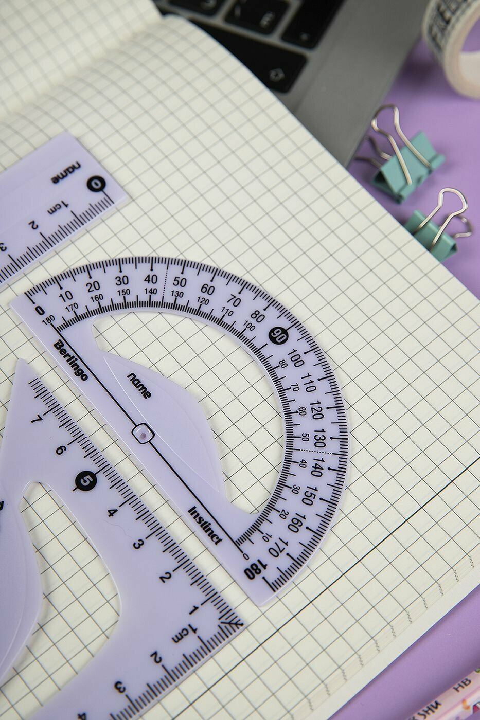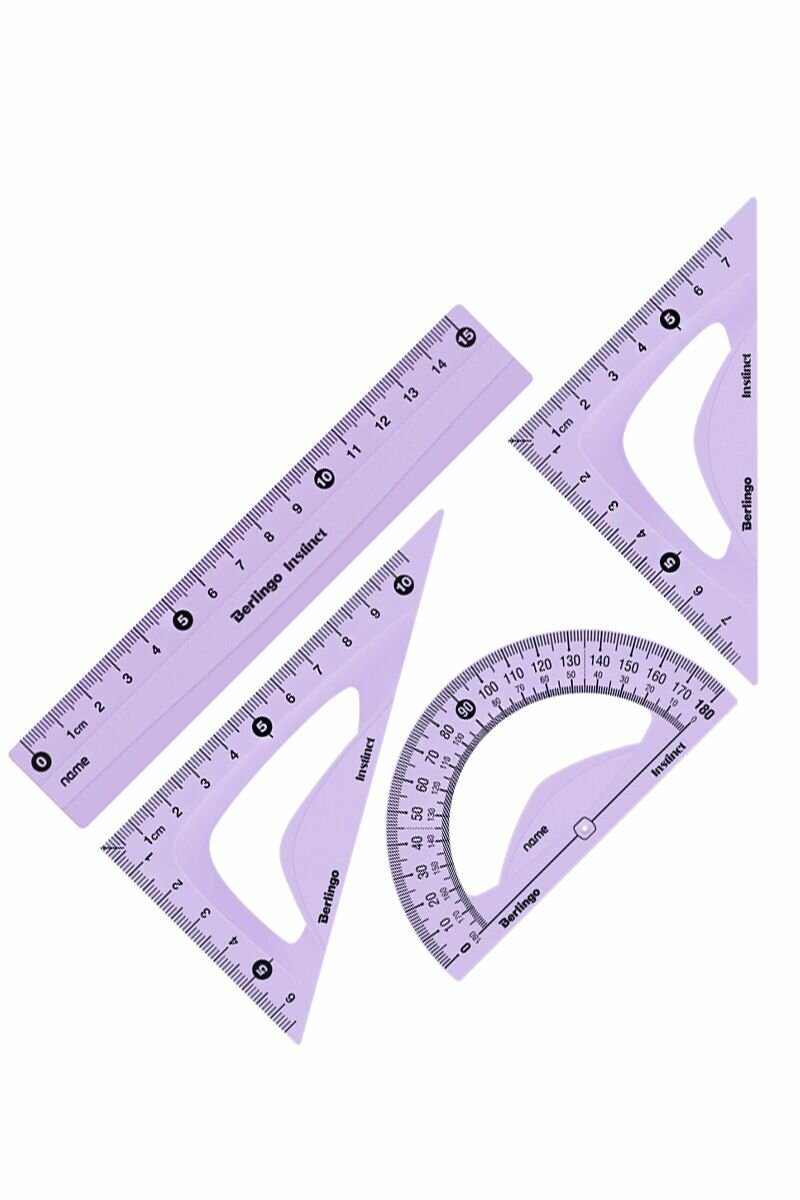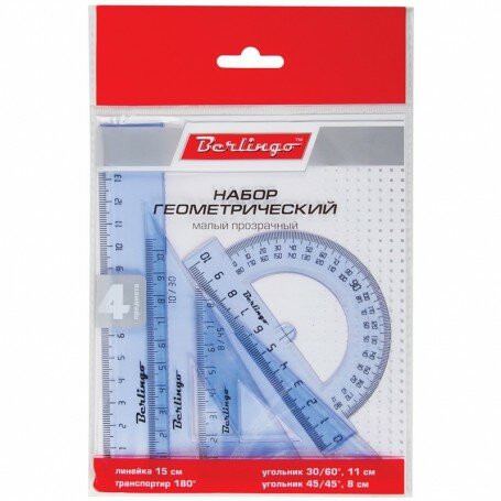 В состав набора входят: линейка 15см, треугольник 30°/60°, треугольник 45°/45°, транспортир 180°.