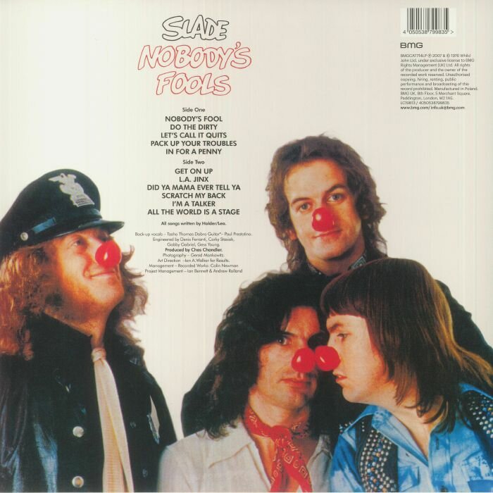 Nobodys Fools - ремастированное переиздание шестого студийного альбома британской рок-группы Slade, первоначально выпущенного в 1976 году. Пластинка была спродюсирована Чесом Чендлером (басист группы The Animal). Это был их последний альбом, появившийся в британских чартах до сборника 1980 года Slade Smashes!. Релиз представлен на прозрачном виниле с красными брызгами. Slade - британская рок-группа, одна из лидеров глэм-рока начала 1970-х. Slade была образована в 1966 году бывшими участниками коллективов The Vendors и Steve Brett & The Mavericks Нодди Холдером (вокал, ритм-гитара), Джимом Ли (бас-гитара, клавишные, скрипка), Дейвом Хиллом (гитара) и Доном Пауэлом (ударные). Первоначально музыканты выступали под названием N’Betweens, под которым выпустили сингл You Better Run, прошедший практически незамеченным. В конце 60-х они сменили название на Ambrose Slade и примерно в это же время их менеджером стал бывший участник The Animals Чес Чендлер. К началу 70-х Slade (так они стали называться к тому времени) успели завоевать репутацию одного из лучших концертных коллективов, однако первые их два альбома коммерческого успеха не имели, несмотря на наличие в них уже вполне зрелого материала (в частности, композиции Wild Winds Are Blowing и The Shape Of Things To Come впоследствии регулярно включались в различные сборники лучших вещей группы). По настоянию менеджмента группа сменила стиль - как внешний (длинные волосы, блестящие костюмы, сапоги на платформе), так и музыкальный (в песнях все более стали использоваться приёмы глэм-рока), а названия и тексты песен писались с нарочито искаженной (как слышится, так и пишется) орфографией. Возможно, в том числе по этой причине в 1971 году случился прорыв, когда два сингла Slade один за другим попали в британский хит-парад: Get Down And Get With It достиг шестнадцатого места, а Coz I Luv You стал хитом номер один. В период с 1971 по 1976 год Slade выдали подряд 17 синглов, вошедших в двадцатку британского хит-парада, став первыми, кому удалось хоть как-то приблизиться к рекорду The Beatles - 22 хит-сингла подряд. Все выпущенные в этот период альбомы группы также пользовались успехом в хит-параде Великобритании, а три из них сумели добраться в нем до первого места. В 1974 году группа снялась в фильме Slade In Flame, в основу сценария которого были положены реальные факты из истории Slade.