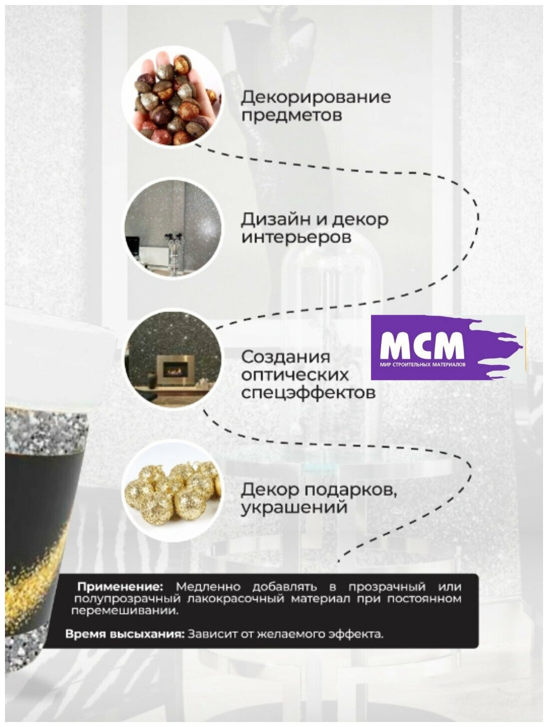 Представляет собой порошок, состоящий из плоских, отражающих частиц размером 0,2 мм шестигранной формы. Добавление в лак, лессирующий состав или в полупрозрачные декоративные штукатурки позволяет создать на поверхности покрытия эффект сверкающих мелких кристаллов.Способ применения: медленно добавлять в прозрачный или полупрозрачный лакокрасочный материал при постоянном перемешивании.Хранение: в оригинальном контейнере в плотно закрытом герметичном состоянии в сухом прохладном месте, защищенном от света, вплоть до момента использования.Предназначена для добавления в лакокрасочные материалы для создания оптических спецэффектов. Только для профессионального использования.Время высыхания: зависит от основы;Вес: 0,05 кг;Цвет: золото.