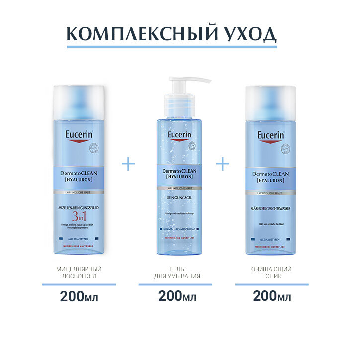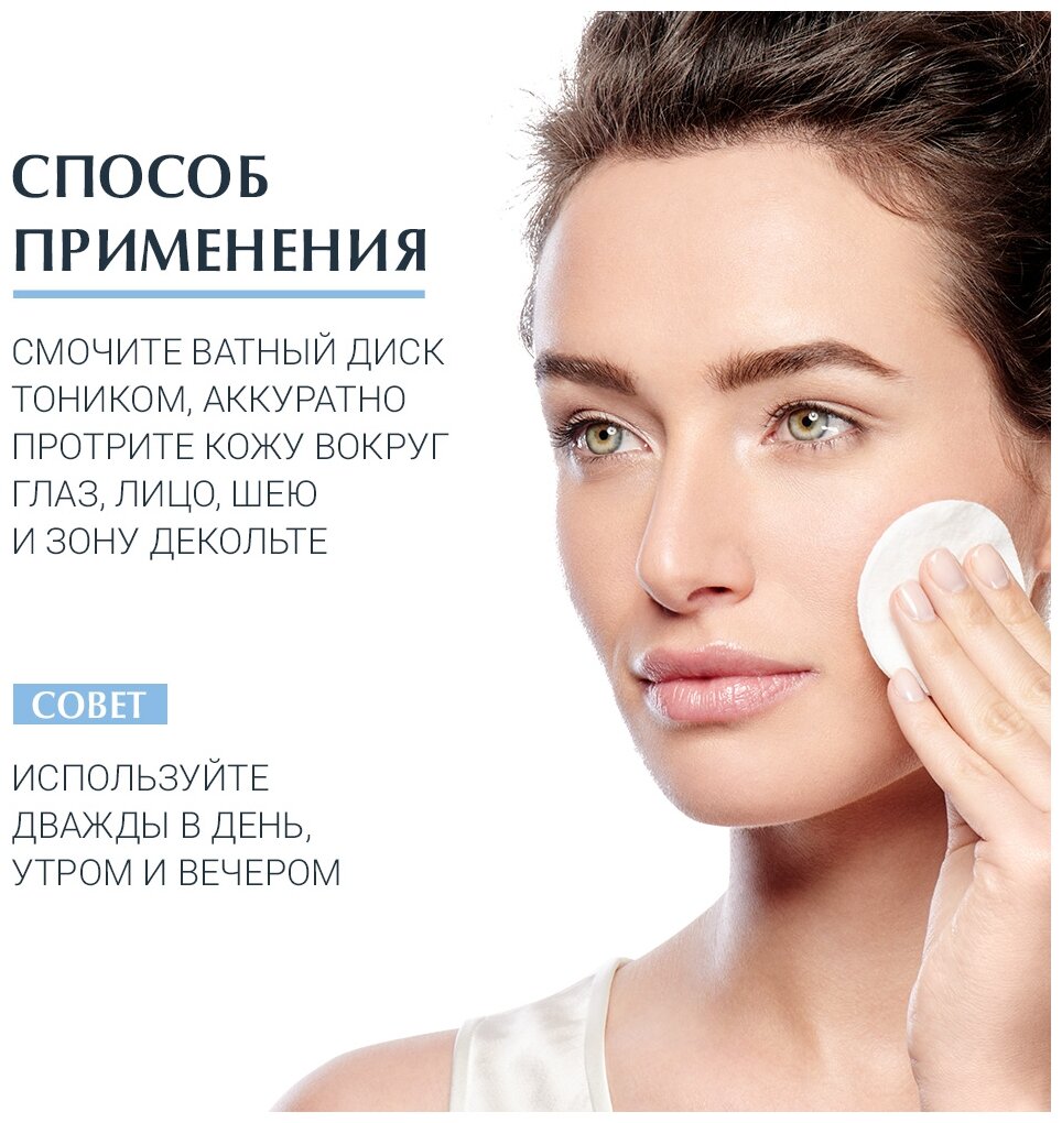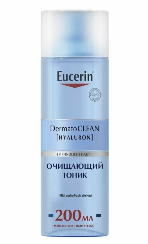 | Способ применения | нанесите тоник Eucerin DermatoClean на ватный диск. аккуратно протрите лицо, шею и декольте, чтобы удалить все остатки очищающего средства |