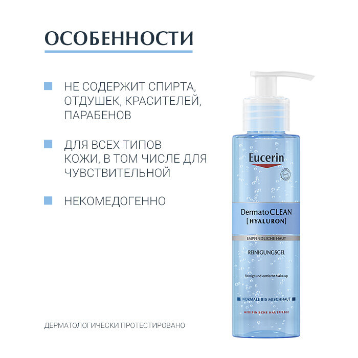 Бренд EUCERIN (Эуцерин) - один из ведущих мировых дермокосметических брендов, одобренных дерматологами и фармацевтами; аптечная косметика по уходу за кожей от немецкого производителя Beiersdorf. Линия DermatoCLEAN - мягкие, но эффективные средства очищения кожи, которые помогают ей дышать. Инновационное сочетание природных активных компонентов помогает эффективно снять макияж и поддержать естественный баланс увлажненности кожи. Кожа очищенная Eucerin DermatoCLEAN становиться чистой, мягкой, успокоенной, обновленной и готовой для регенерации. EUCERIN DERMATOCLEAN ГЕЛЬ ДЛЯ УМЫВАНИЯ ОСВЕЖАЮЩИЙ И ОЧИЩАЮЩИЙ - для всех типов кожи, в том числе чувствительной Внешний вид и свойства: Прозрачный гель без парфюмерных отдушек, пенится при контакте с водой.