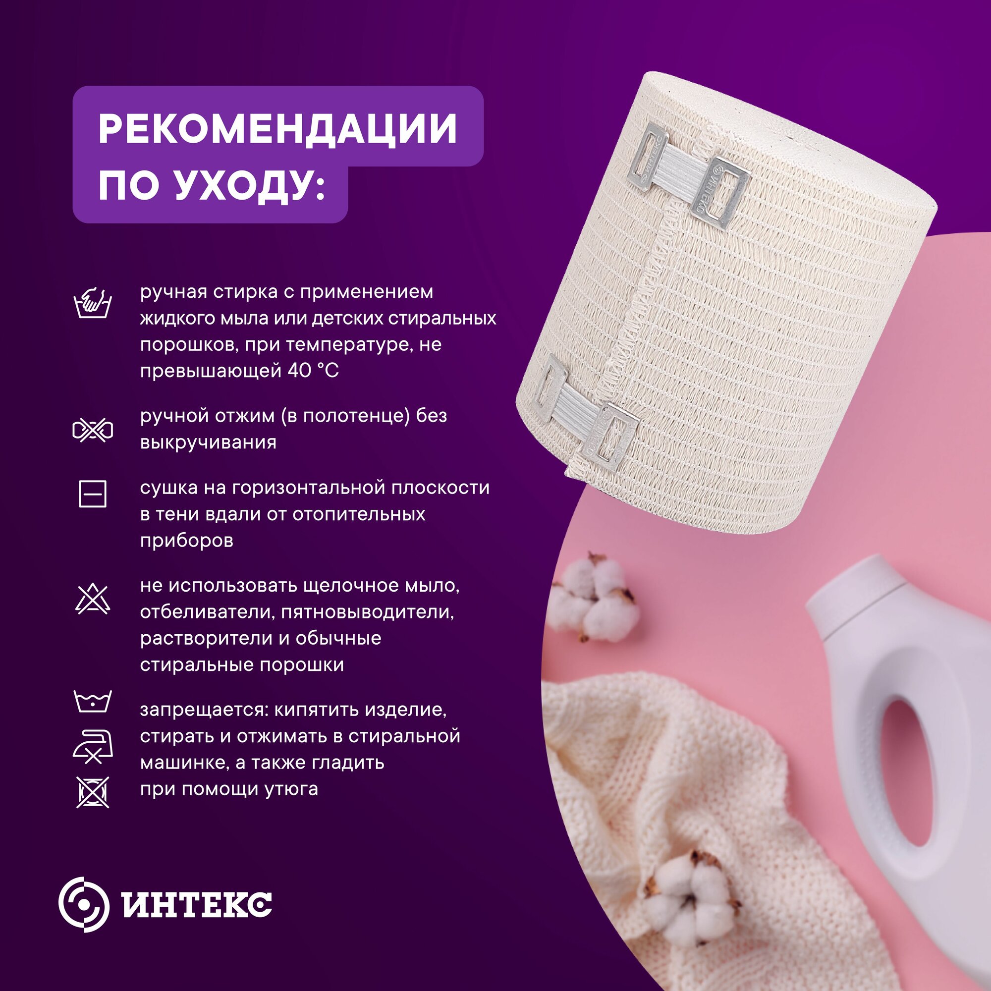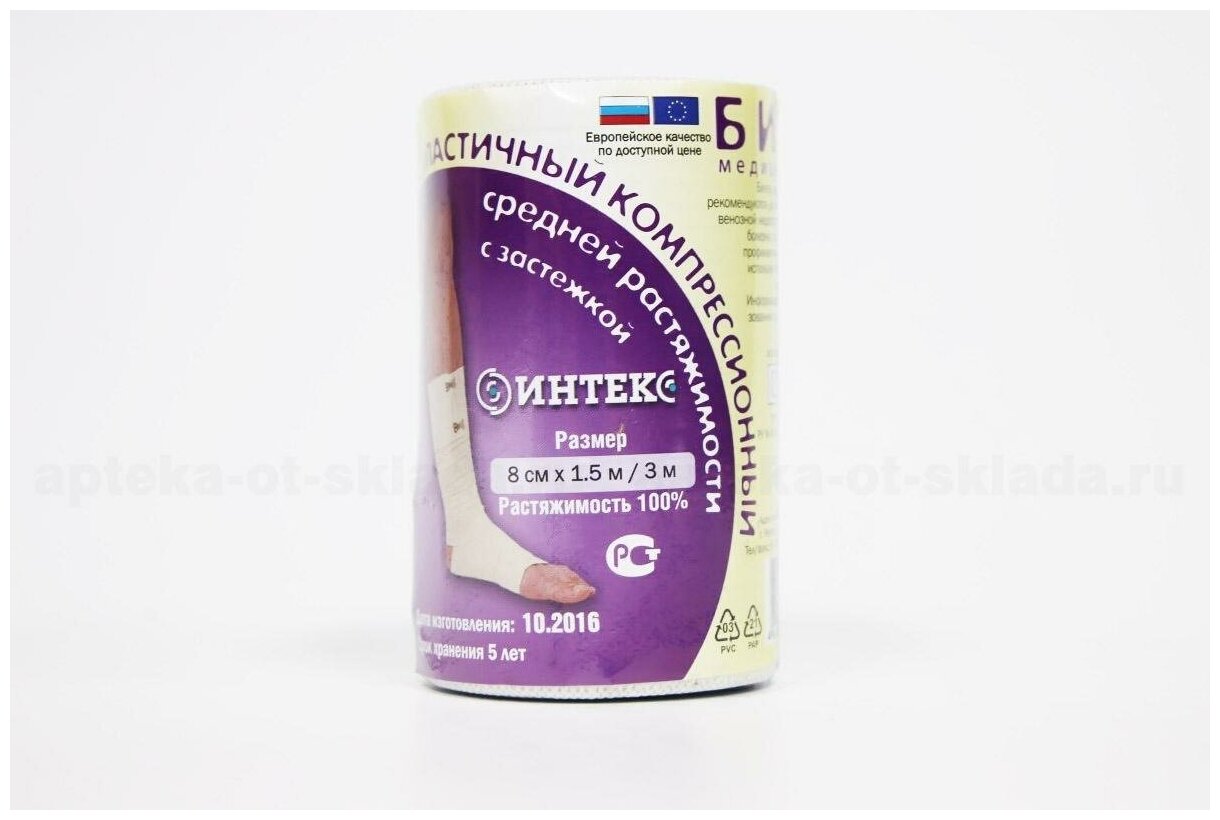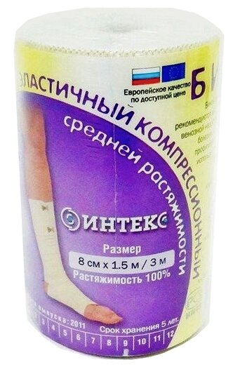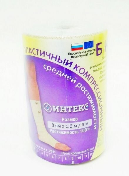 Эластичные бинты «интекс» очень хорошо растягиваются, устойчивы как деформациям и растяжениям, не сползают и надежно фиксируются, являются многоразовым товаром и могут использоваться как лечебное средство без назначения врача. В комплекте с эластичными бинтами идут две клипсы. Эластичные компрессионные бинты «интекс» средней растяжимости (растяжимость бинта не менее 100%) используют во время лечения острых и хронических заболеваний вен, варикозного расширения вен, травматических осложнений (вывихи, отёки, растяжения), лимфостаза различного генезиса и травм опорно-двигательного аппарата. Часто бинты со средней растяжимостью применяют после удаления вен и подобных оперативных вмешательствах, а так же, склеротерапии, в том числе катетерной. Давление, которое оказывают бинты средней растяжимости, соответствует 2-3 классу компрессии в классификации медицинского белья с компрессией. Компрессионные бинты обеспечивают давление на любом участке тела. Во время движения компрессионный эффект бинтов усиливается (активная компрессия), в покое — приходит к начальному, заложенному при наложении бинта. В состав изделий входят хлопок, латекс, полиэфирные волокна. Большое содержание хлопка снижает вероятность развития кожных реакций и аллергии. Структура полотна компрессионных бинтов не затрудняет кожное дыхание, хлопок хорошо впитывает влагу и кожные выделения.