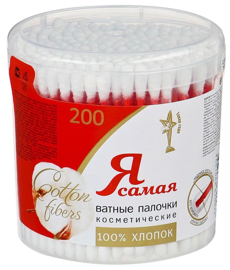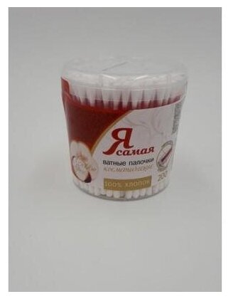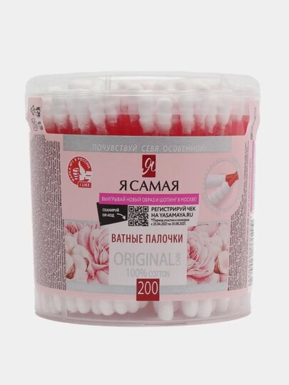 Ватные палочки Я Самая Косметические изготовлены из стопроцентного хлопка. Изделия применяются для косметических и гигиенических целей. Мягкие белые ватные подушечки, имеющие классическую форму, аккуратно намотаны на пластиковые палочки, имеющие длину 75 мм.
