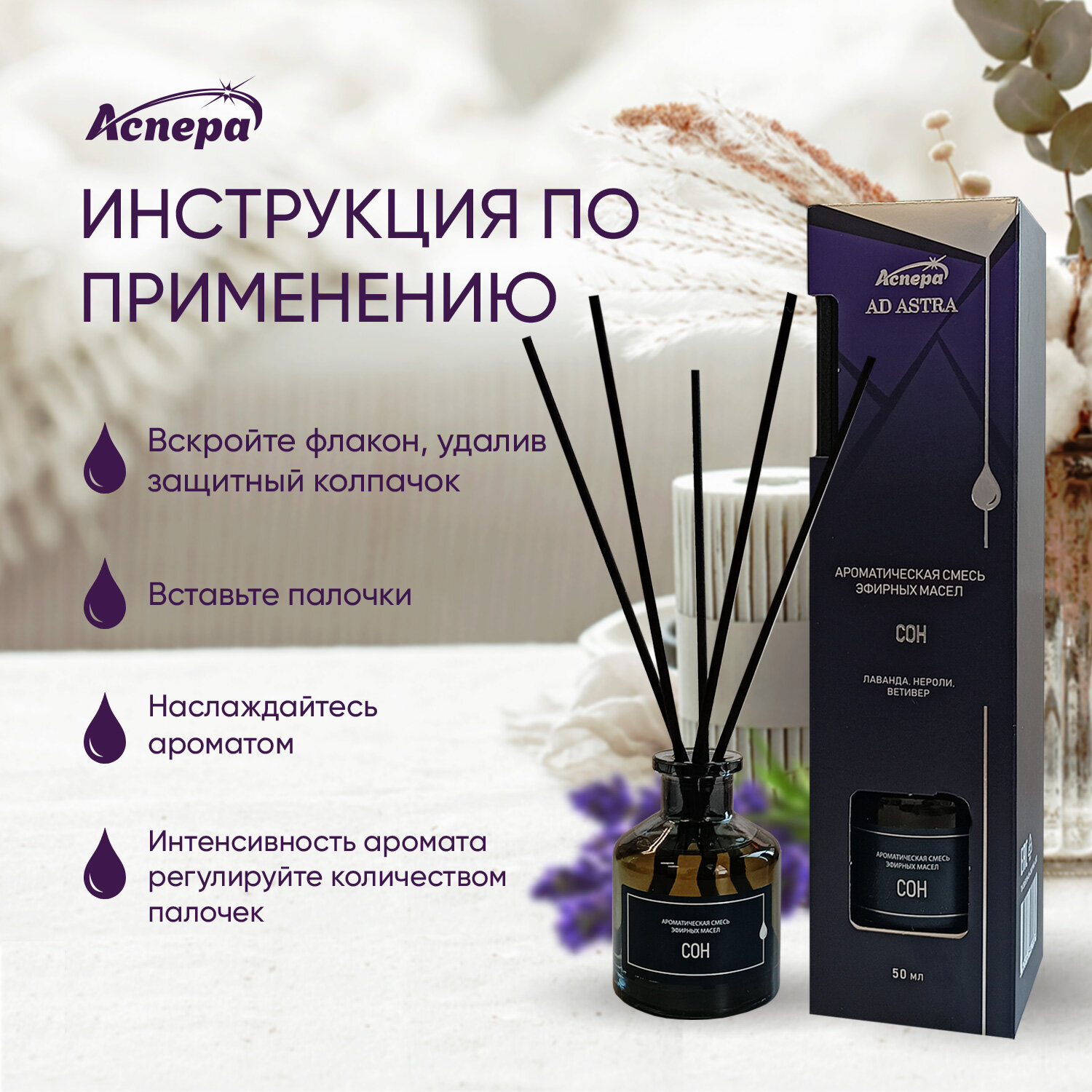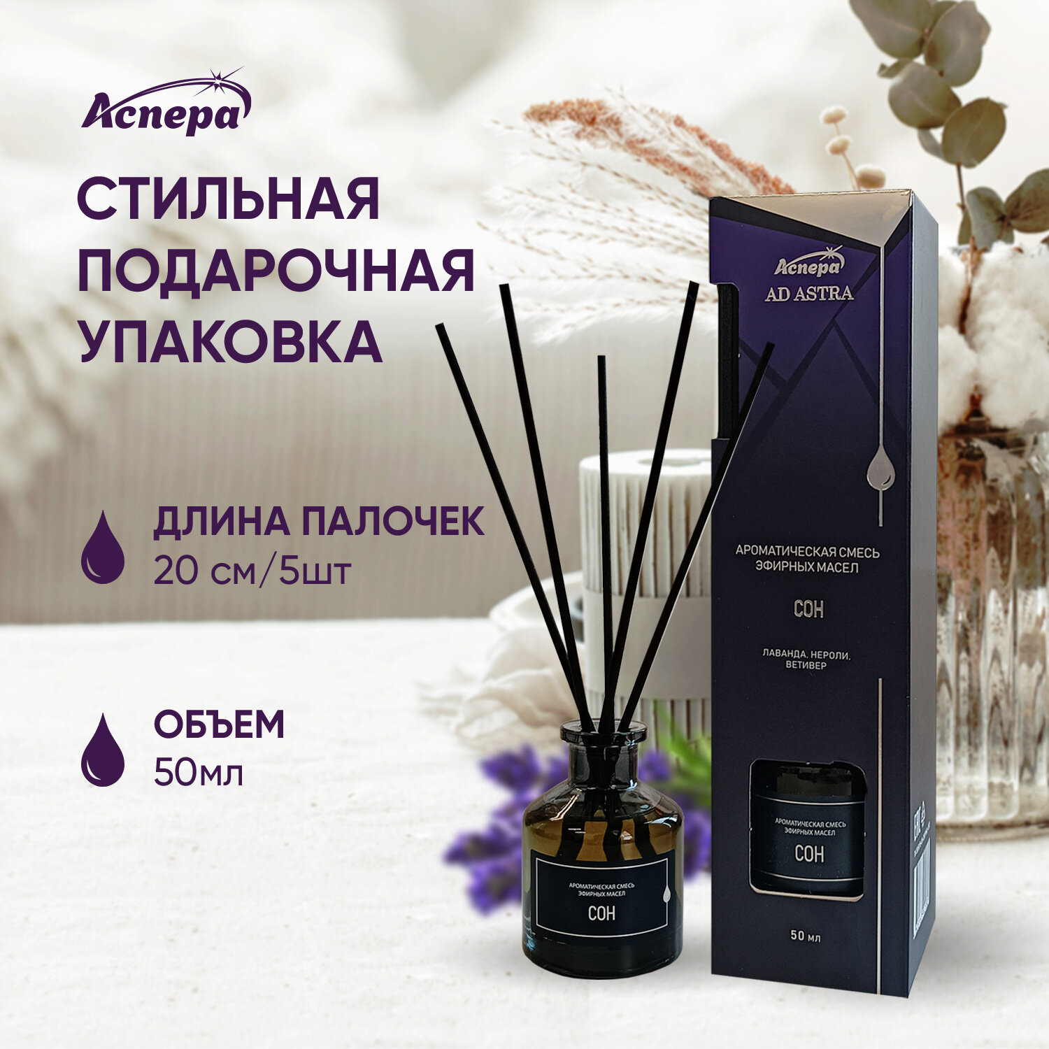 Аромат для дома в современном мире крайне важен. Ваш дом-ваши правила. Интерьерный ароматизатор – это аксессуар, помогающий в создании атмосферы. Диффузор с натуральными ароматами, оригинальные палочки флер наркотик класса премиум, используемые в парфюмерии, искусно сочетаются в этом парфюме для дома. Дизайн и формат продукта позволяет использовать этот аромадиффузор в различных помещениях, благодаря стеклянной бутылке и ротанговым палочкам. Аромадиффузор с палочками – это элегантное сочетание функциональности и эстетики. Домашние духи позволят Вам наслаждаться ароматическими благовониями в течение всего дня, оставаясь натуральным и свежим. Заполните интерьерные помещения своей квартиры ароматами, которые устранят плохие запахи. Аромат для дома Сон. Состав: Лаванда, нероли, ветивер Вдохни силу природы Аромат для дома СОН восстанавливает нервную систему и стабилизирует сон. Успокаивающий эффект лаванды в сочетании с терпким ароматом нероли расслабляет, восстанавливает душевную гармонию, снимает раздражительность и нервозность. Древесный аромат ветивера дополняет композицию, улучшает качество сна и подавляет излишнюю возбудимость. Ароматизатор воздуха “Сон”. Вдохни силу природы Способ применения: вскройте упаковку, аккуратно извлеките флакон с ароматной смесью и комплекс палочек. Разместите флакон на ровную поверхность, недоступную для детей и домашних питомцев. Вскройте флакон, удалив защитную пробку и вставьте палочки. Интенсивность аромата регулируется количеством палочек во флаконе – чем меньше палочек, тем менее выражен аромат. Запах распространится по комнате и настроит Вас на приятные сновидения. Меры предосторожности: Избегайте попадания на кожу – возможны аллергические реакции. Только для наружного применения. При попадании на кожу промойте большим количеством воды с мылом, при попадании в глаза – осторожно промойте водой или обратитесь ко врачу. Состав: 30% и более: растворитель, комплекс эфирных масел (лаванды, нероли, ветивера); 5% или более: вода; линалоол. Условия хранения: В сухом месте при температуре от +5 до +25.