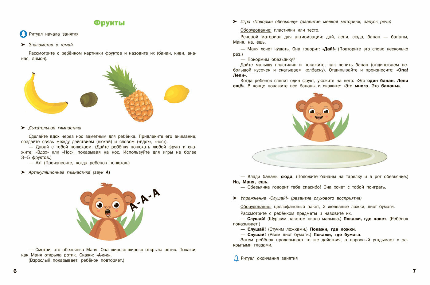 Пособие направлено на запуск и развитие речи малыша, развитие фонематического слуха, внимания, словарного запаса. Содержит 30 лексических тем, игры и задания на развитие речевых навыков, игры на развитие слухового внимания, артикуляционные упражнения, дыхательные упражнения, пальчиковые игры.