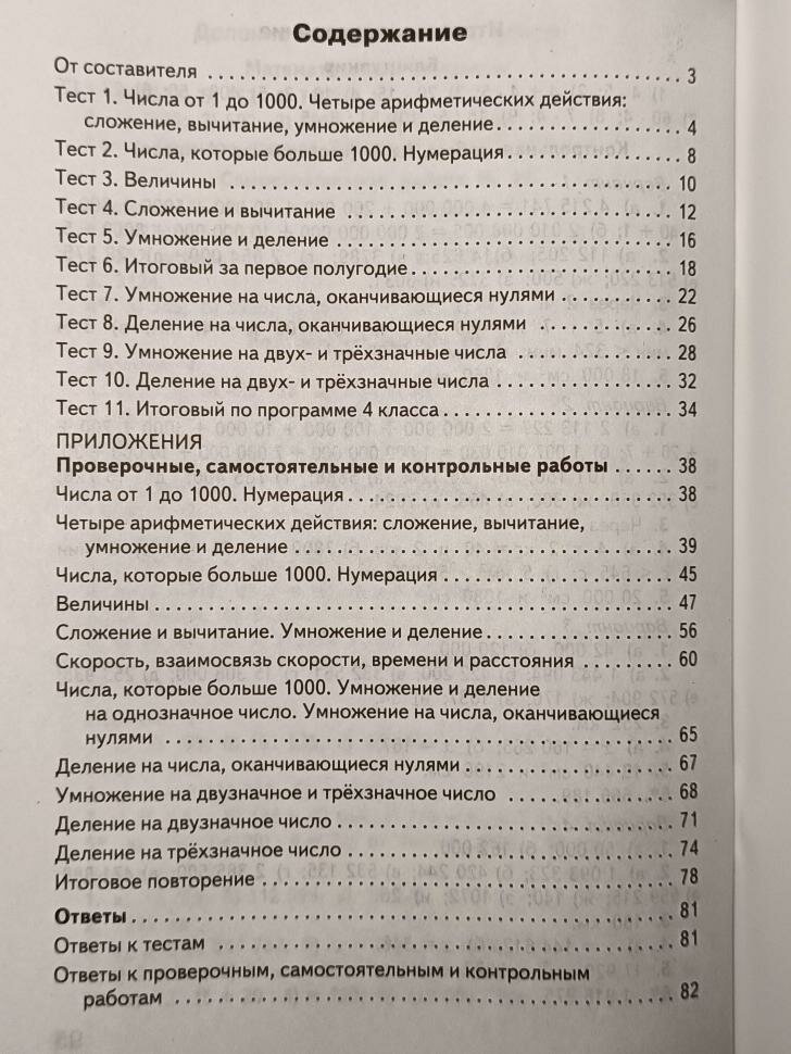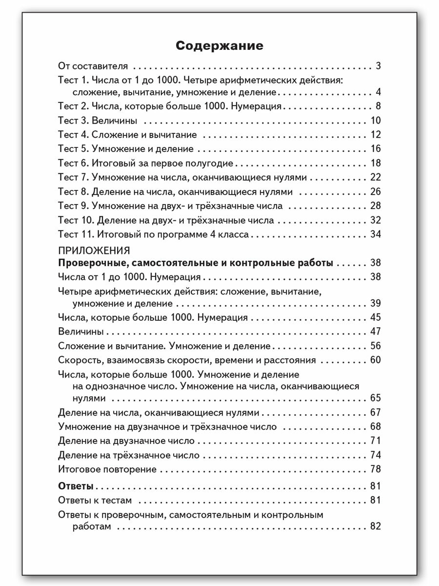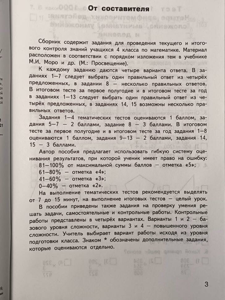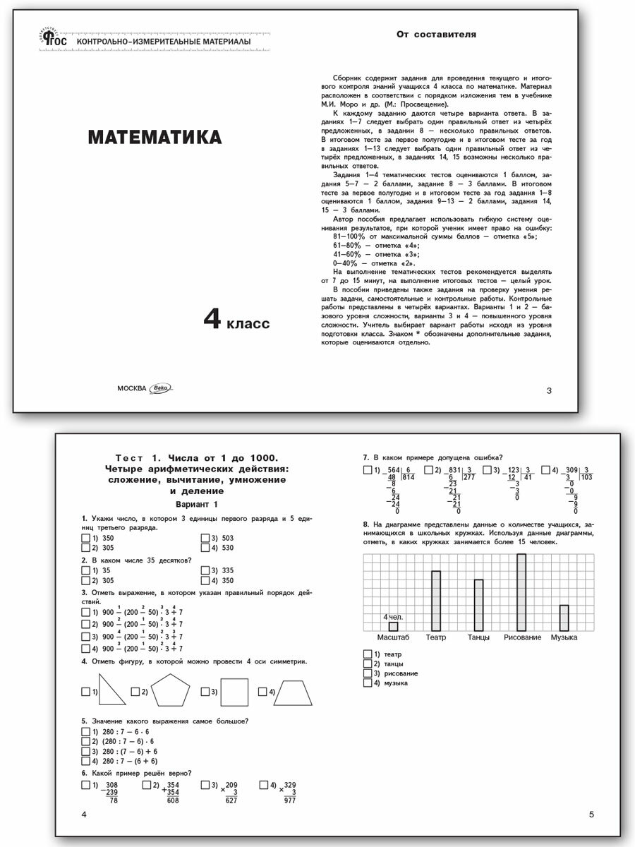 В пособии представлены контрольно-измерительные материалы по математике для 4 класса. Порядок тем соответствует учебнику М.И. Моро и др. УМК «Школа России», входящему в действующий федеральный перечень учебников. Все задания соответствуют программе общеобразовательных организаций и требованиям ФГОС-2021 для начальной школы. Систематическая работа с материалами сборника позволит обучить школьников работе с тестами, что поможет в дальнейшем успешно выполнить задания государственной аттестации. Издание адресовано учителям начальных классов, школьникам и их родителям.