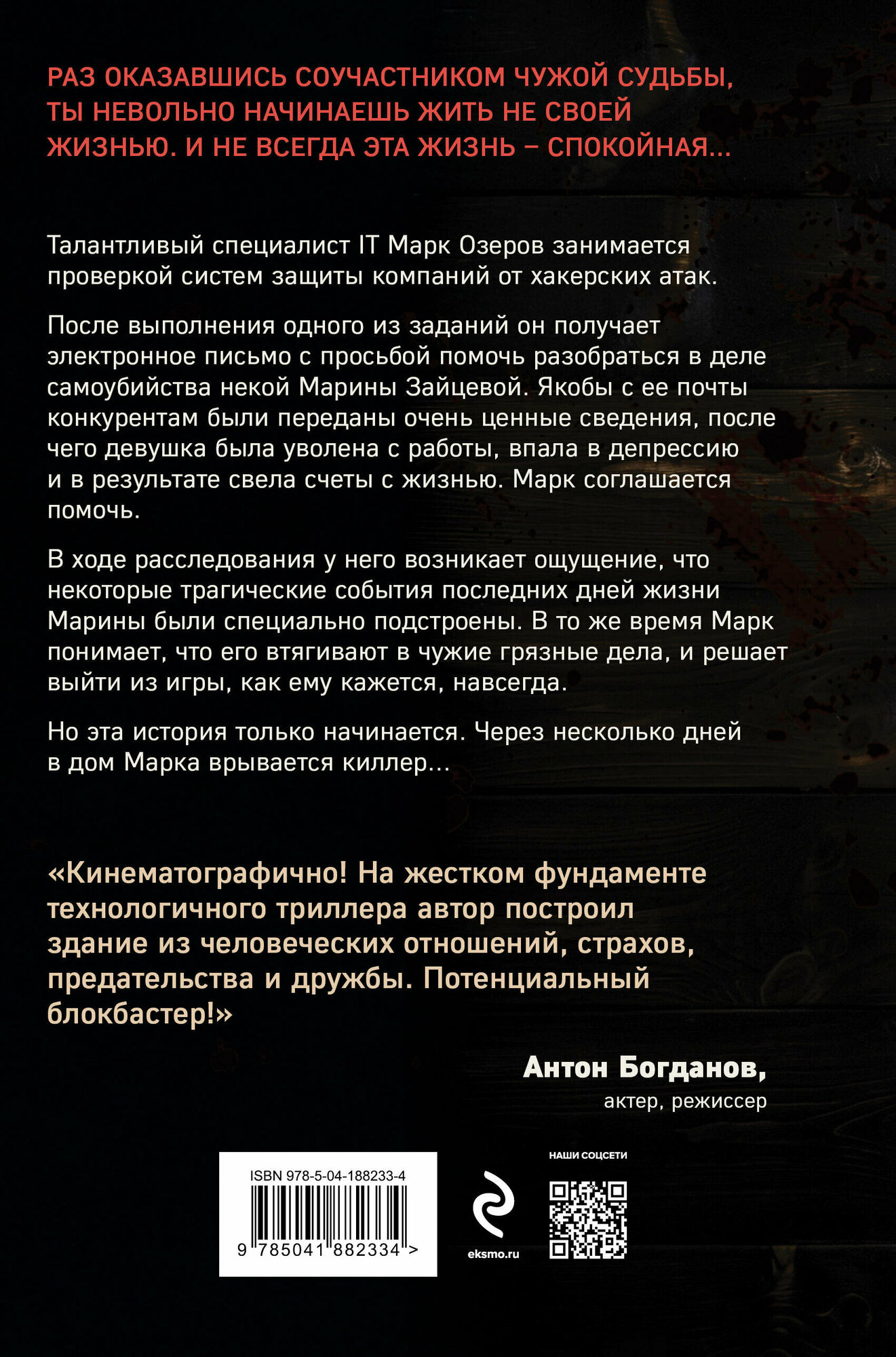 «Кинематографично! На жестком фундаменте технологичного триллера автор построил здание из человеческих отношений, страхов, предательства и дружбы. Потенциальный блокбастер!» — Антон Богданов, актер, режиссер