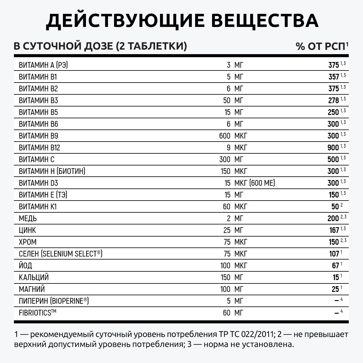 | Состав | Кальция карбонат, аскорбиновая кислота, магния оксид, премикс "Sternvit FS 181020" (витамины А, В1, В2, В3, В5, В6, биотин, В9, В12, С, D3, Е), цинка цитрат трёхводный, фруктово-овощная смесь "Fibriotics", никотинамид, токоферола ацетат, ретинола ацетат, кальция пантотенат, меди аспарагинат, биоперин, тиамина мононитрат, рибофлавин, холекальциферол, пиридоксина гидрохлорид, витамин К1, йодказеин, хрома пиколинат, фолиевая кислота, селенметионин, биотин, цианокобаламин, вспомагательные вещества. |