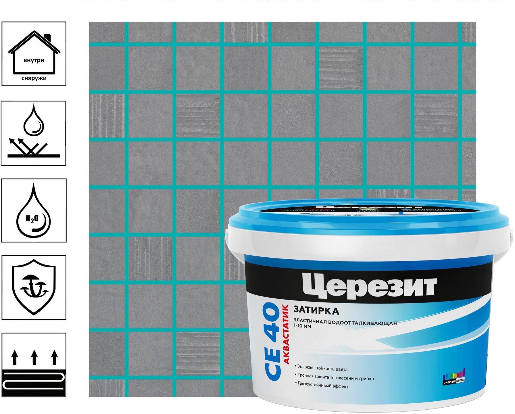 Ceresit СЕ 40 Aquastatic. Благодаря высокой эластичности затирка может применяться на деформирующихся основаниях (древесностружечных плитах, гипсокартоне и др.) и основаниях, подверженных температурным колебаниям (полах с подогревом, террасах, ваннах открытых бассейнов и т.п.).