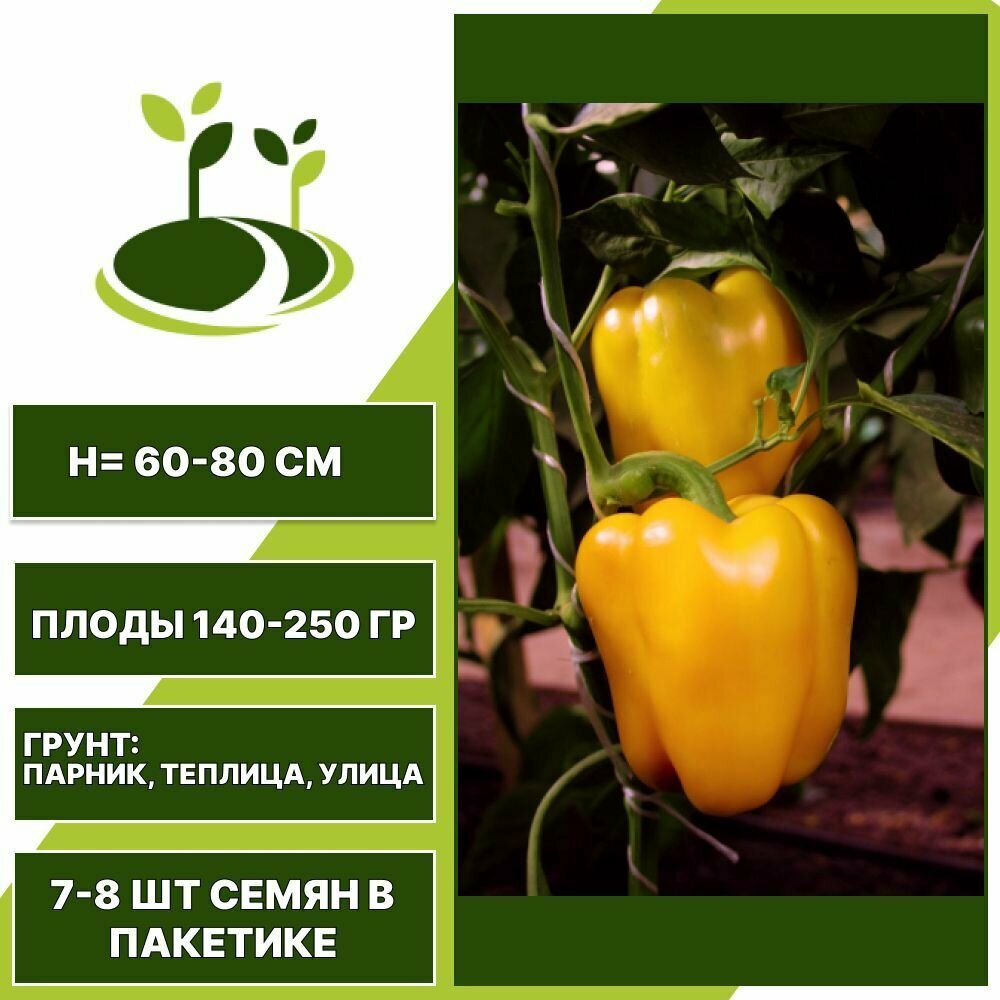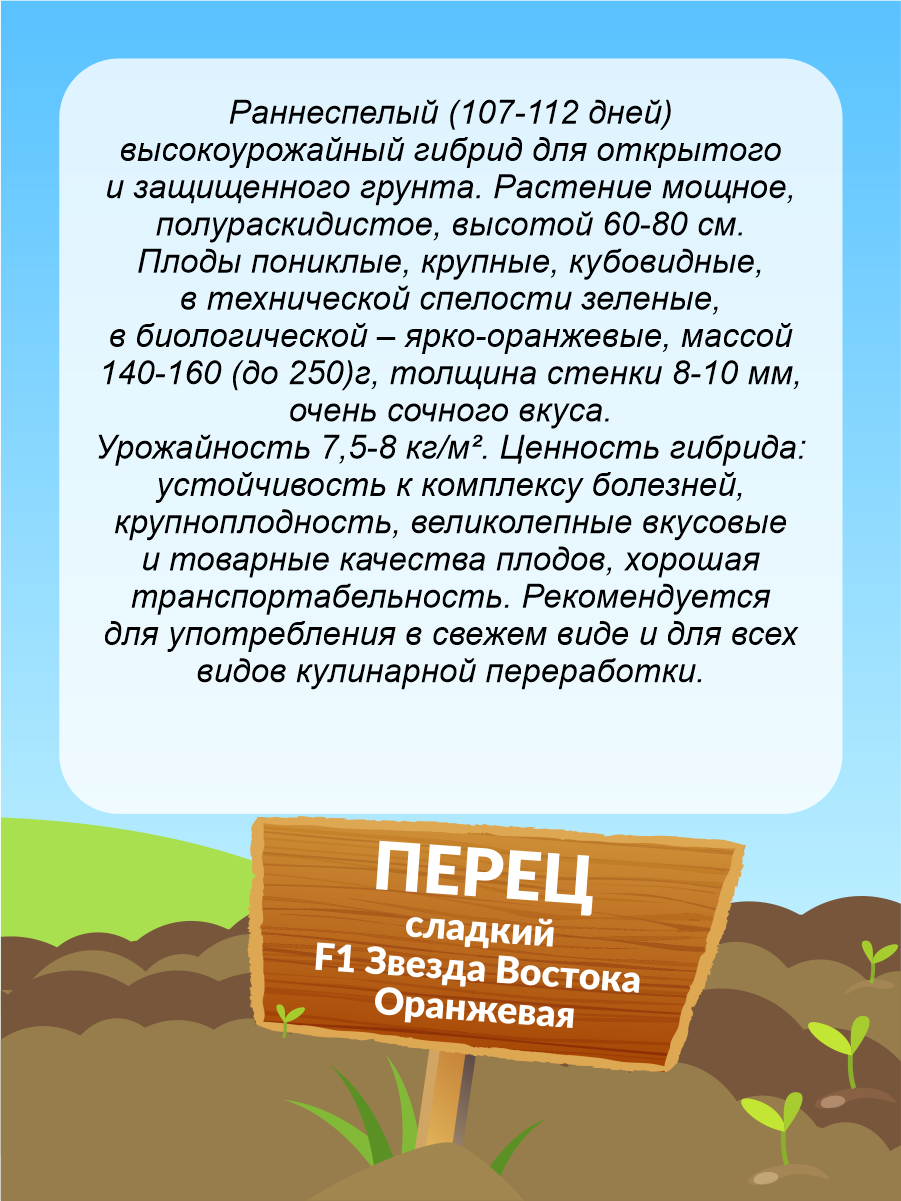 Раннеспелый (107-112 дней) высокоурожайный гибрид для открытого и защищенного грунта. Растение мощное, полураскидистое, высотой 60-80 см. Плоды пониклые, крупные, кубовидные, в технической спелости зеленые, в биологической - ярко-оранжевые, массой 140-160 (до250) г, толщина стенки 8-10 мм, очень сочного вкуса. Урожайность 7,5-8 кг/м2. Ценность гибрида: устойчивость к комплексу болезней, крупноплодность, великолепные вкусовые и товарные качества плодов, хорошая транспортабельность. Рекомендуется для употребления в свежем виде и для всех видов кулинарной переработки.