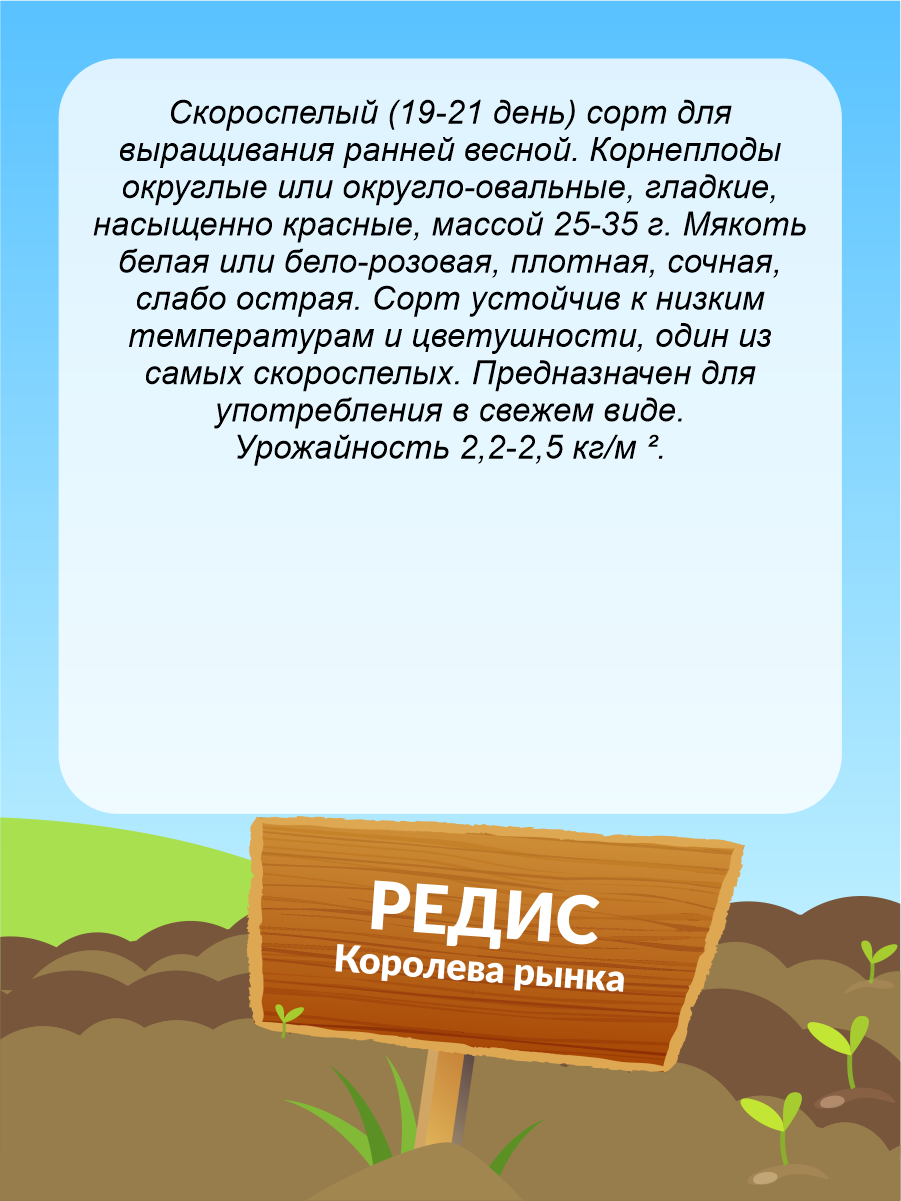 Скороспелый (19-21 день) сорт для выращивания в ранневесенние сроки посевов. Корнеплоды округлые или округло-овальные, гладкие, насыщенно-красные, массой 25-35 г. Мякоть белая или бело-розовая, плотная, сочная, слабоострая. Урожайность 2,2-2,5 кг/м². Ценность сорта: устойчивость к низким температурам и цветушности, один из самых скороспелых. Рекомендуется для употребления в свежем виде, приготовления весенних салатов и окрошки.