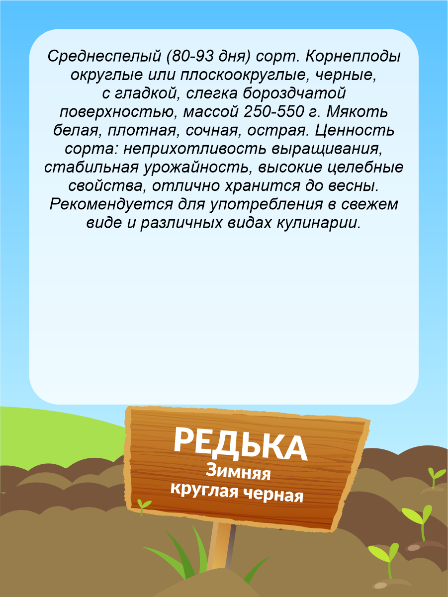Корнеплоды редьки зимней созревают за 80-93 дня. Сорт относится к среднеспелым культурам. Овощи черного цвета, округло-плоские или круглые. Вес редьки - в пределах 250-500 г. Мякоть острая, очень сочная и плотная. Прекрасно хранится продолжительное время, имеет целебные свойства. Применяется в свежем виде.