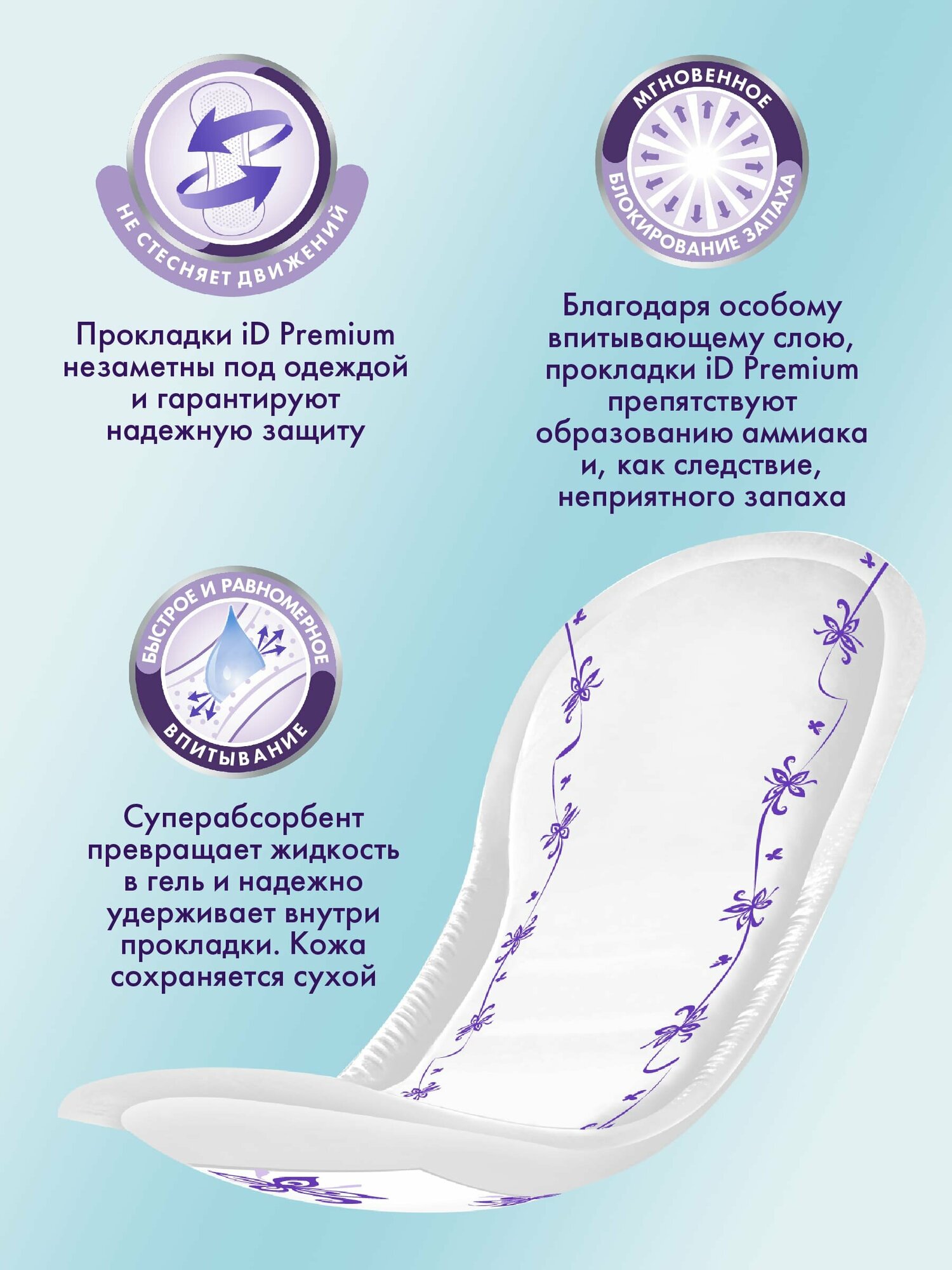 Урологические прокладки iD Premium представлены в следующих размерах — Mini, Normal, Extra и Maxi. Разработаны специально для современных женщин с недержанием легкой и средней степени, которые живут активной жизнью, занимаются спортом, присматривают за детьми, строят карьеру и стремятся заботиться о себе. Гибкость, мягкость и прочная фиксация делает их идеальными для любых видов активности — шопинга или работы в офисе, прогулок по городу или отдыха на природе, подвижных игр с детьми или занятий спортом. Абсорбирующий слой надежно удерживает влагу, а двойная защита от протеканий предотвращает ее попадание на одежду. iD Premium имеют утонченный дизайн с цветным женственным принтом. Изделие обеспечивает комфортную защиту от симптомов недержания, помогает продолжать чувствовать себя женственной и уверенной. Состав: Целлюлоза, нетканый материал, полиэтилен, SAP - суперабсорбент, клей, нить эластомерная. Способ применения: Удалив клейкую ленту, закрепить прокладку на белье.
