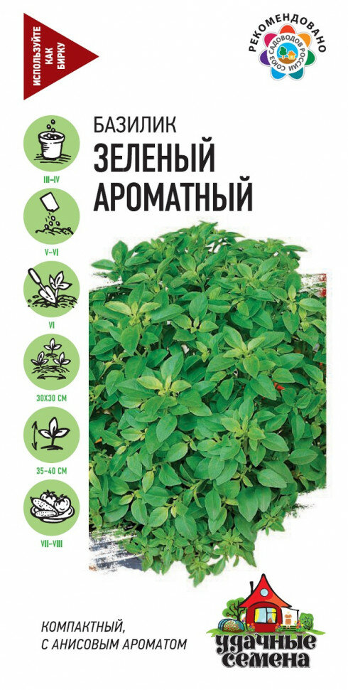 Среднеранний урожайный сорт. Куст компактный, полураскидистый, хорошо облиственный, высотой 40-50 см. Листья слабопузырчатые, зеленого цвета, ароматные. Вкус мягкий, терпкий. Базилик богат витаминами, минеральными веществами, обладает тонизирующими свойствами, улучшает пищеварение. Выращивается в рассадной и безрассадной культуре. Предпочитает хорошо структурированные, богатые гумусом почвы. Нуждается в регулярных поливах. Рекомендуется для использования в свежем виде в качестве салатной зелени, пряно-вкусовой добавки и натурального ароматизатора в кулинарии и при консервировании.