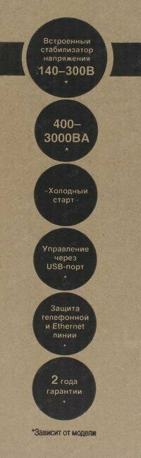 | Виды защиты | защита сети (порт RJ-45), от глубокого разряда батареи, от импульсных помех, от короткого замыкания, от перегрузки |