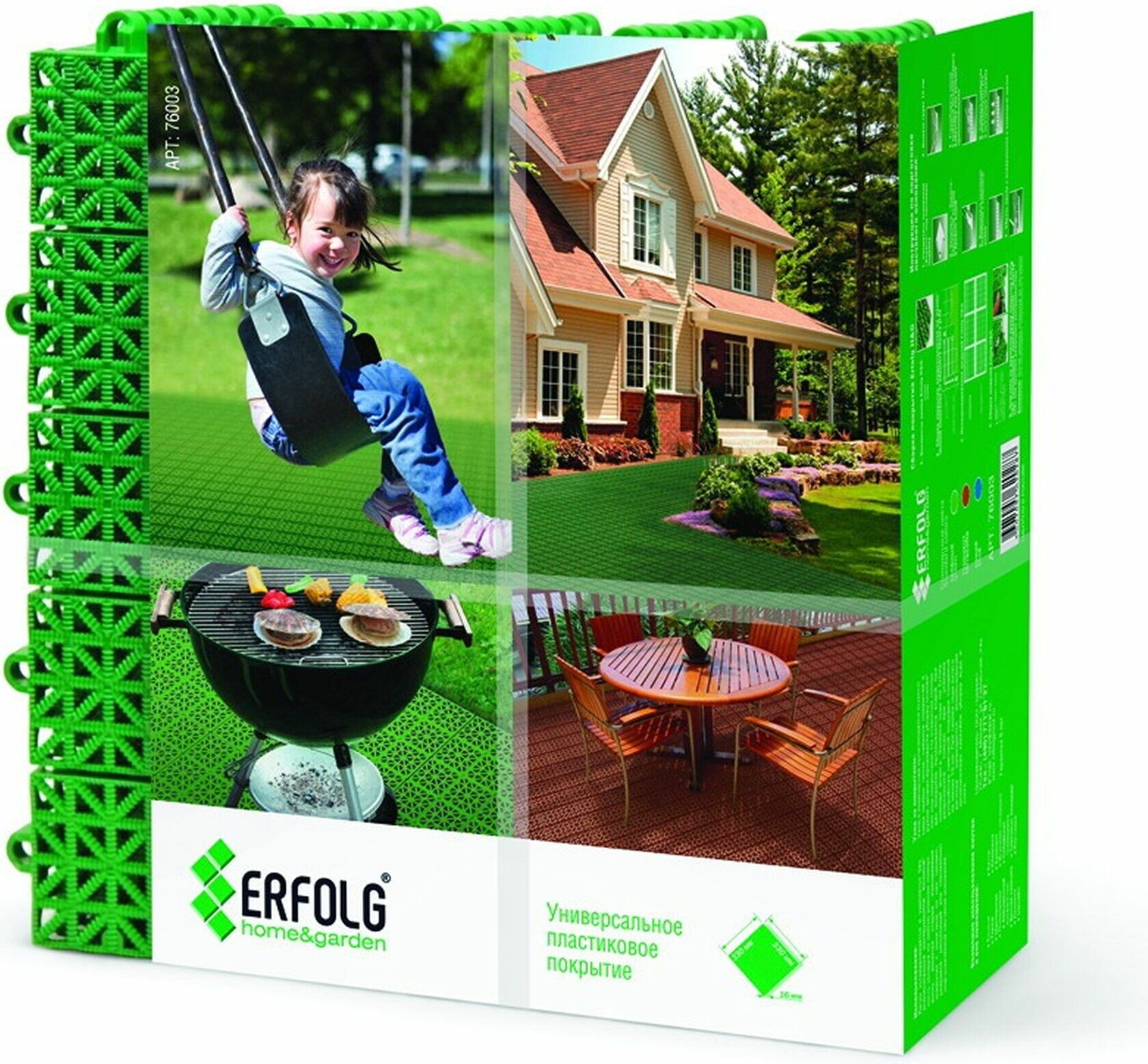 Модульное пластиковое покрытие ERFOLG зеленое 33х33 см используется для оформления придомовых территорий, детских и спортивных площадок, пешеходных зон и др.