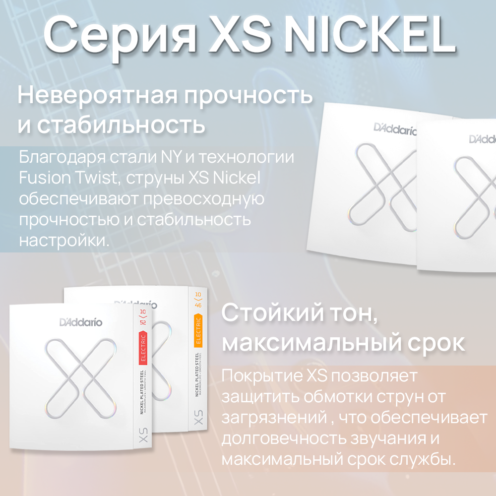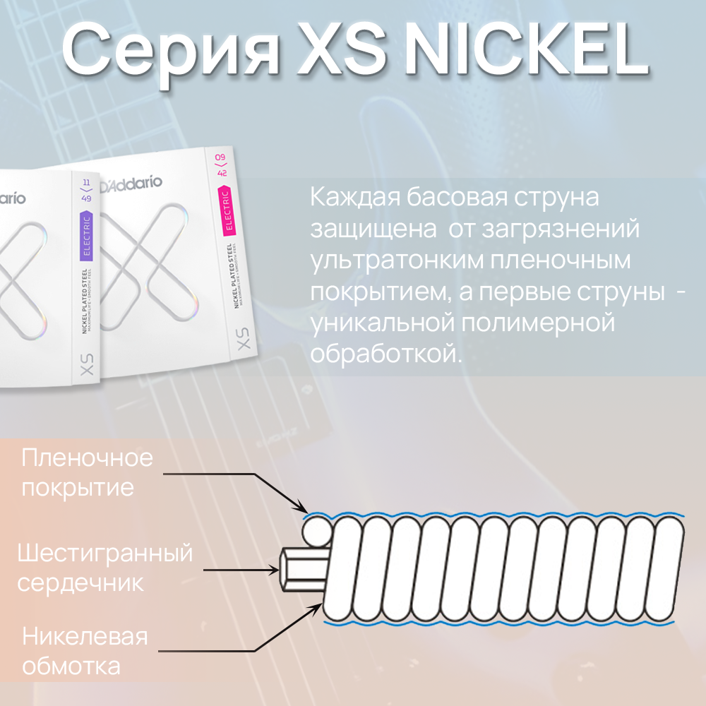 Струны для электрогитар XS с никелевым покрытием обеспечивают самый долгий срок службы среди всех струн для электрогитар бренда. Покрытые революционным покрытием XS, эти электрические струны премиум-класса обеспечивают максимальный срок службы и сохраняют первоначальную яркость звучания. Струны XS Nickel, изготовлены с сердечником из стали NY Steel, никелированной стальной проволоки и технологии Fusion Twist, отличаются превосходной прочностью, а также более богатыми гармониками, большей четкостью при каждом взмахе, скольжении и изгибе. Калибр комплекта: .009, .011, .016, .024, .032, .042.