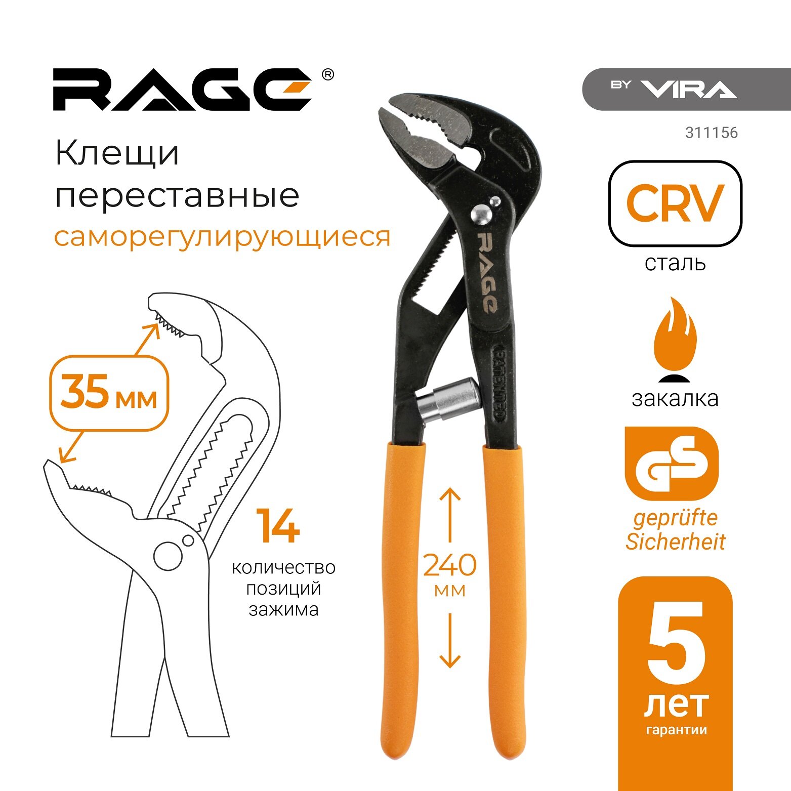 Клещи переставные 240 мм саморегулирующиеся RAGE by VIRA Саморегулирующийся храповый механизм Предназначены для захвата и удержания деталей или крепежа Материал хромованадиевая сталь CRV фосфатное покрытие повышенная защита от коррозии Длина инструмента 240 мм 10 Раскрытие зева от 1 до 35 мм Колво позиций зажима 14 Твердость зажимных поверхностей 5458HRC Рукоятки PVC. Клещи переставные RAGE by VIRA имеют специальный саморегулирующийся механизм, исключающий необходимость регулировки раскрытия зева. При зажатии рукояток клещи автоматически сдвигаются до необходимого размера, а пружинный ограничитель обеспечивает правильное положение рукояток в сведенном состоянии. Закаленные зубцы на рабочих губках обеспечивают надежный захват. Заливные рукоятки клещей не проворачиваются при работе и не скользят в руке.