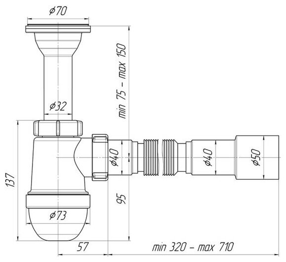 Сифон бутылочного типа предназначен для кухонной мойки с диаметром сливного отверстия 50 мм. Выполнен с литым выпуском и нержавеющей решёткой. Для подключения к канализации комплектуется гибкой трубой размером 40 × 40/50 мм.