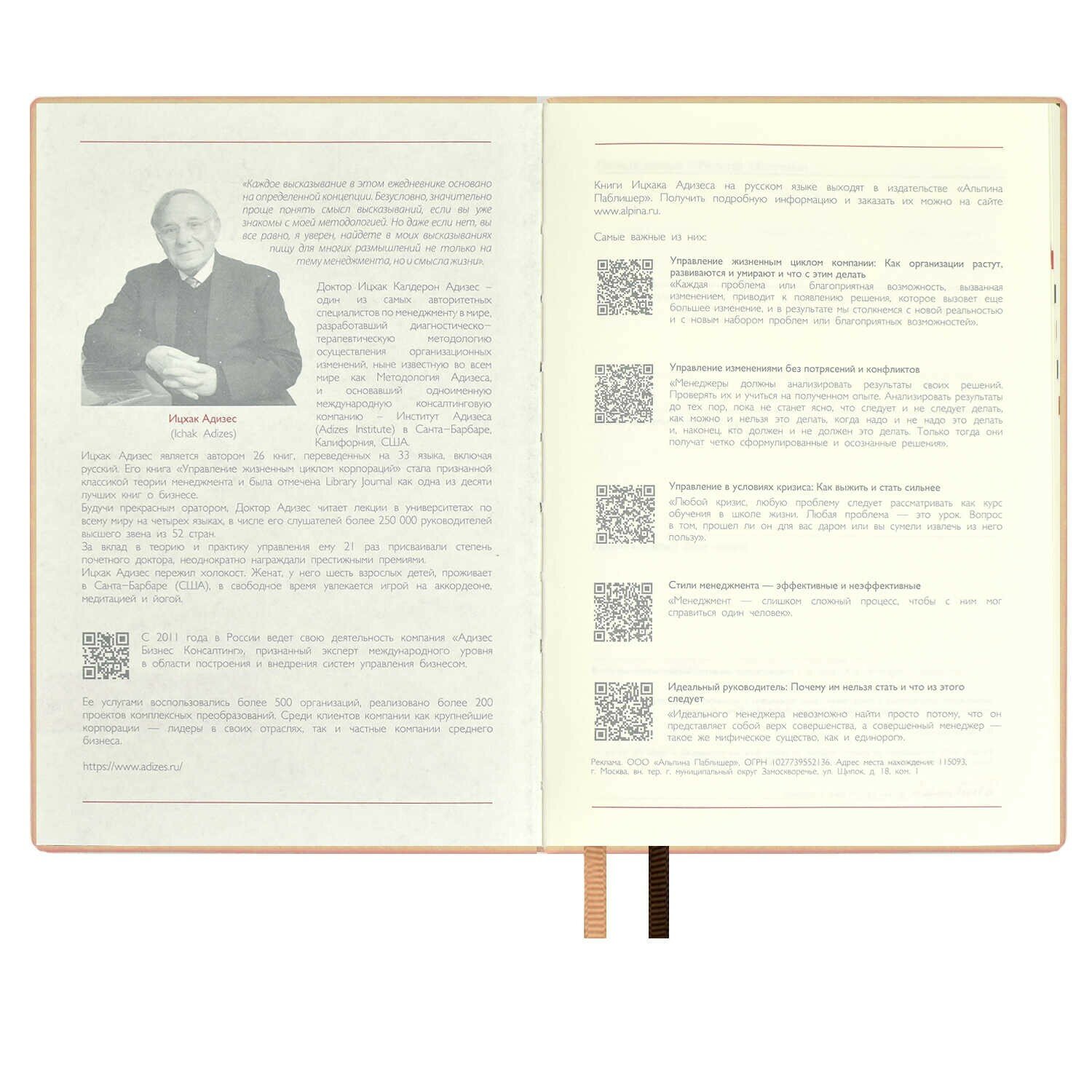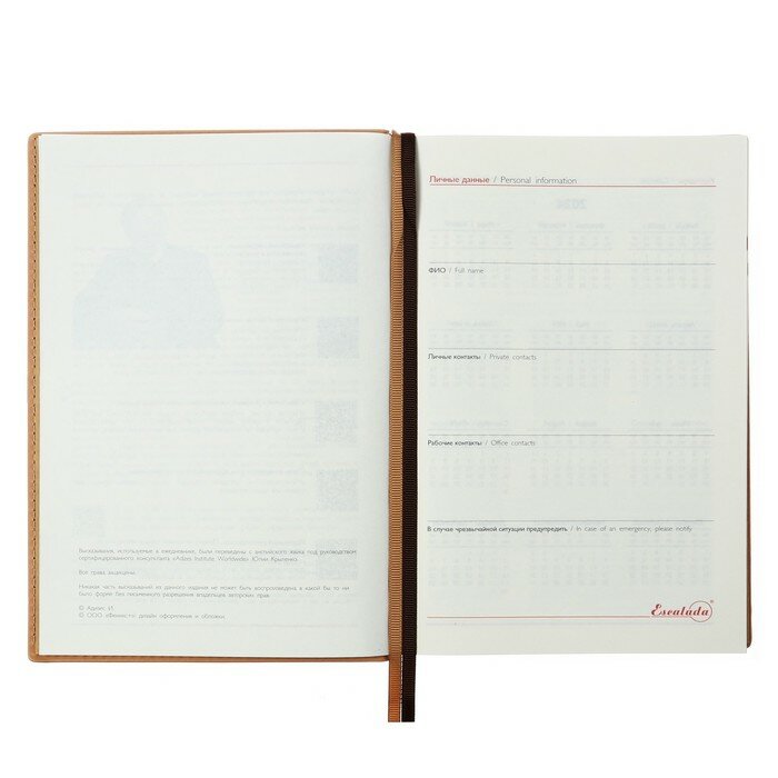 Ежедневник датированный 2024 ESCALADA, формат А5 (146x211 мм), 176 л. Обложка: твёрдый переплёт, запаянный край, тиснение фольгой, есть, скруглённый корешок, прямые углы обложки. Внутренний блок: ниткошвейный, кремовый офсет 70 г/м?, печать в две краски (линия), прямые углы блока, нет, есть. Красочность форзаца: печать пантоном. Закладка: два ляссе. Каптал: есть. Особенности: в блоке использованы мотивирующие высказывания одного из известнейших бизнес-консультантов мира, ведущего специалиста в области эффективного управления бизнес-процессами, преподавателя, автора 29 книг – доктора Ицхака Калдерона Адизеса, комбинированные материалы. Индивидуальная упаковка: промостикер + ПЭТ-пакет.