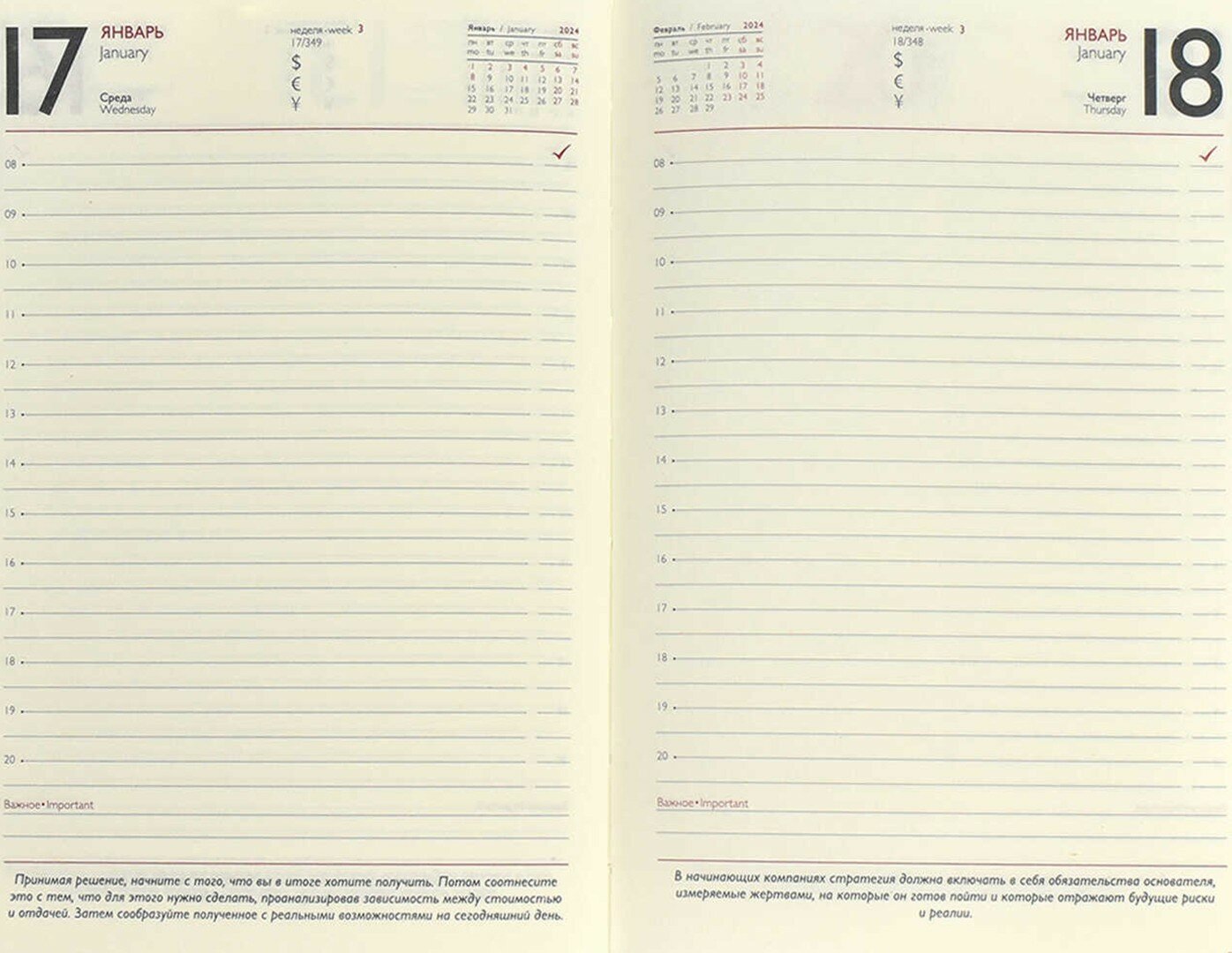Ежедневник датированный 2024 ESCALADA, формат А5 (146х211 мм), 176 л. Обложка: интегральный переплёт, металлические уголки, тиснение фольгой, нет, скруглённый корешок, прямые углы обложки. Внутренний блок: ниткошвейный, белый офсет 70 г/м?, печать в две краски (линия), прямые углы блока, нет, есть. Красочность форзаца: печать пантоном. Отделка среза: фольгирование. Закладка: два ляссе. Каптал: есть. Особенности: в блоке использованы мотивирующие высказывания одного из известнейших бизнес-консультантов мира, ведущего специалиста в области эффективного управления бизнес-процессами, преподавателя, автора 29 книг – доктора Ицхака Калдерона Адизеса. Индивидуальная упаковка: промостикер + ПЭТ-пакет.